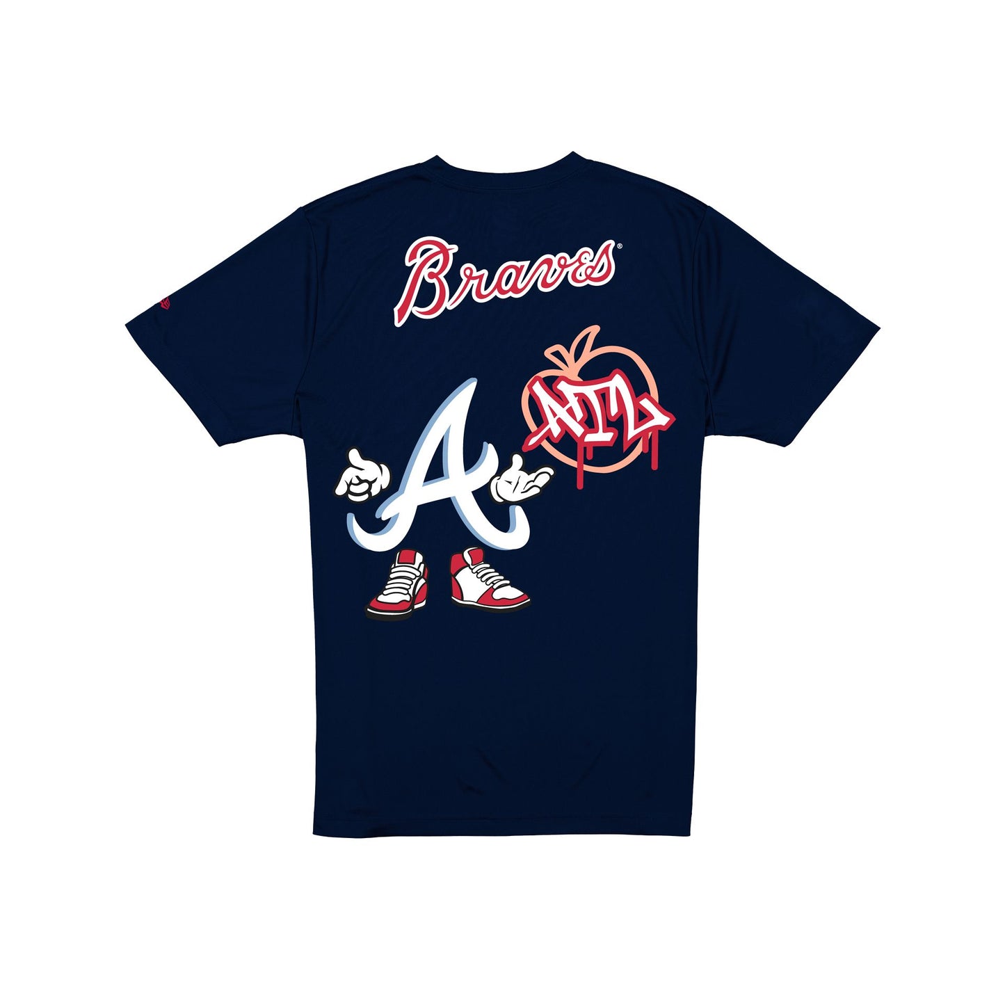 The Atlanta Braves Cartoon Navy T-Shirt features a screen-printed Braves logo at the left chest with a cartoon logo at the rear.