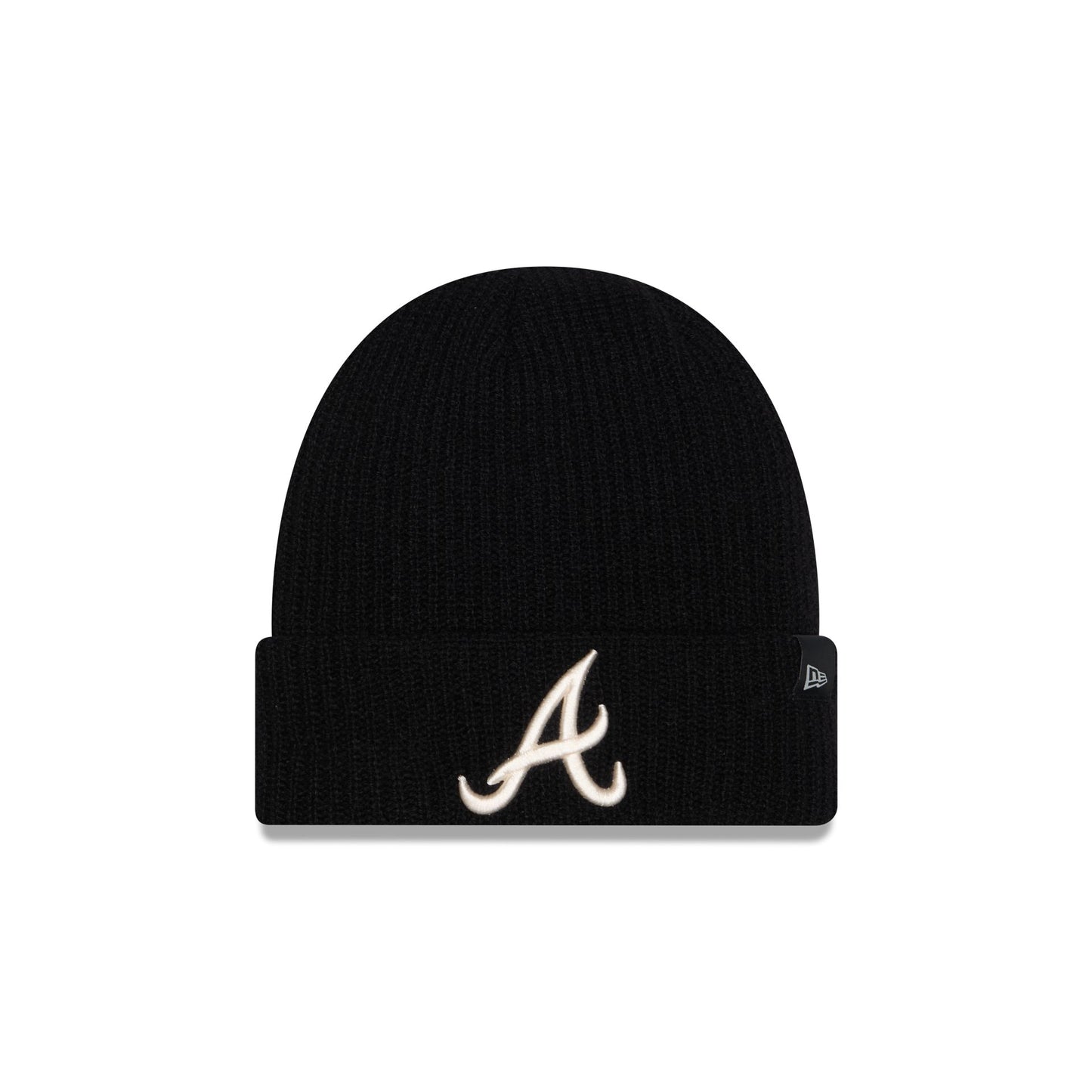 The Atlanta Braves Cashmere Black Cuff Knit features an embroidered Braves logo at the front with a woven New Era Flag tag at the left-wear side.