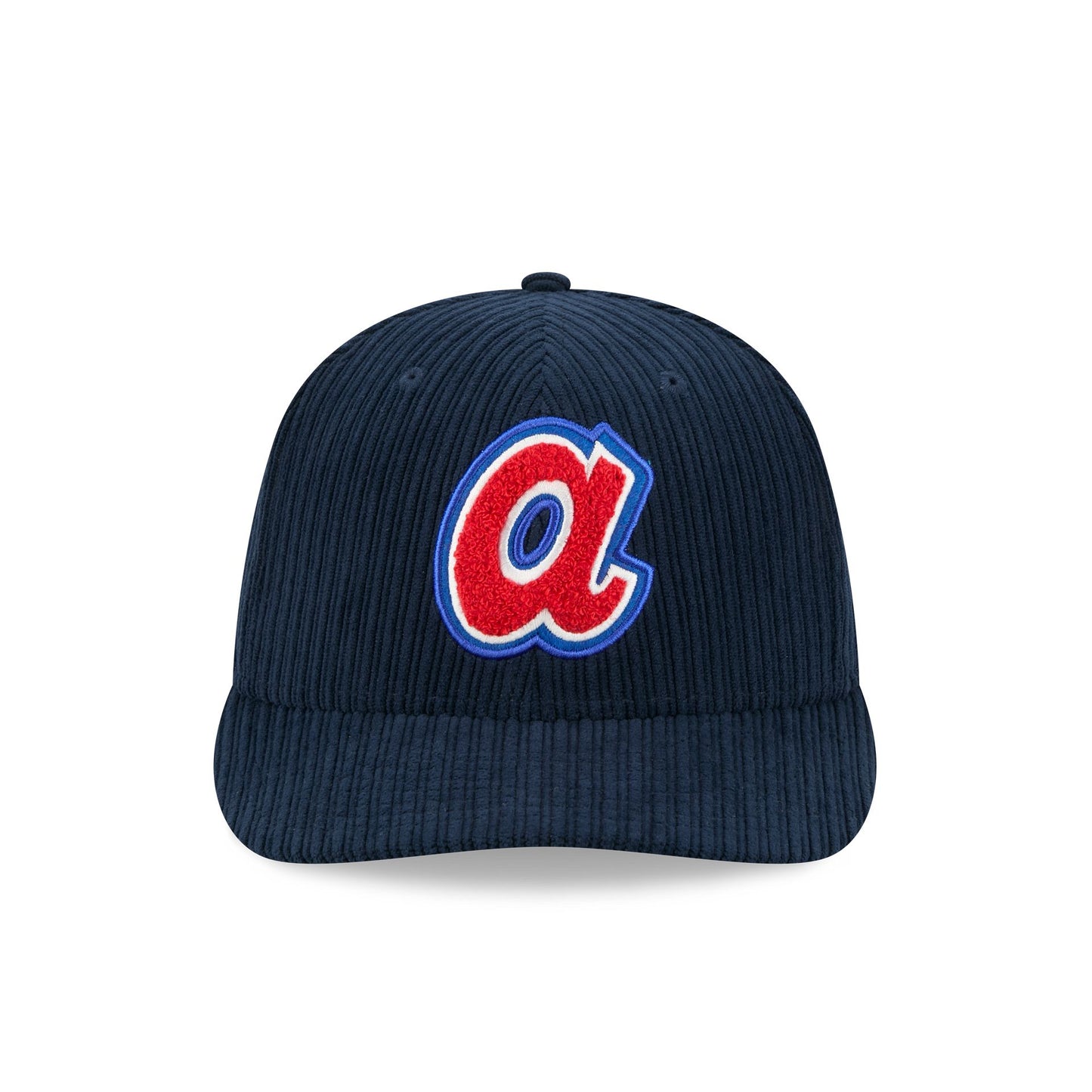The Atlanta Braves Chenille Pop 59FIFTY Fitted Cap features an embroidered Braves chenille logo at the front panels with a soft striped fabric throughout the cap. Additional details include a matching MLB Batterman logo at the rear and a gray undervisor. This cap comes with a pre-curved visor.