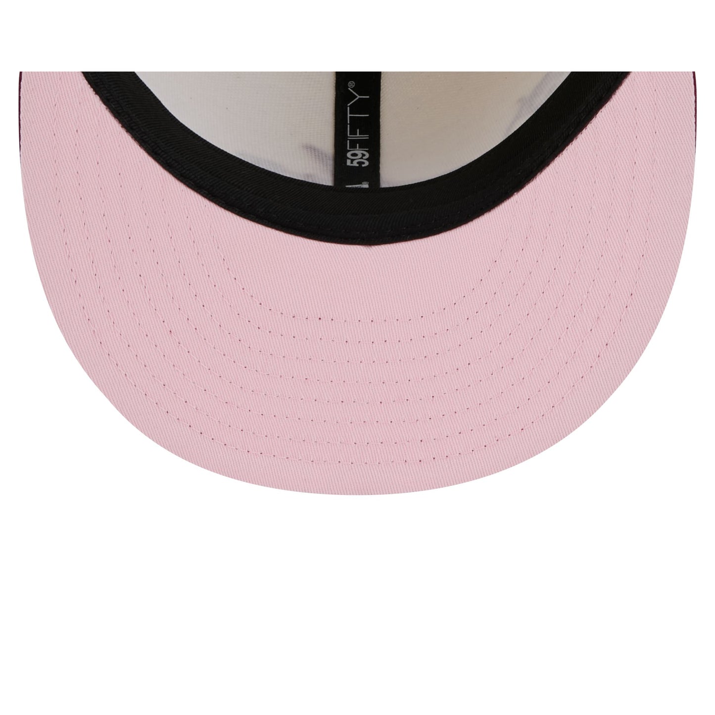 The Atlanta Braves Cherub 59FIFTY Fitted Cap features an embroidered Braves logo and cherub angel at the front panels with a matching MLB Batterman logo at the rear and a pink undervisor.