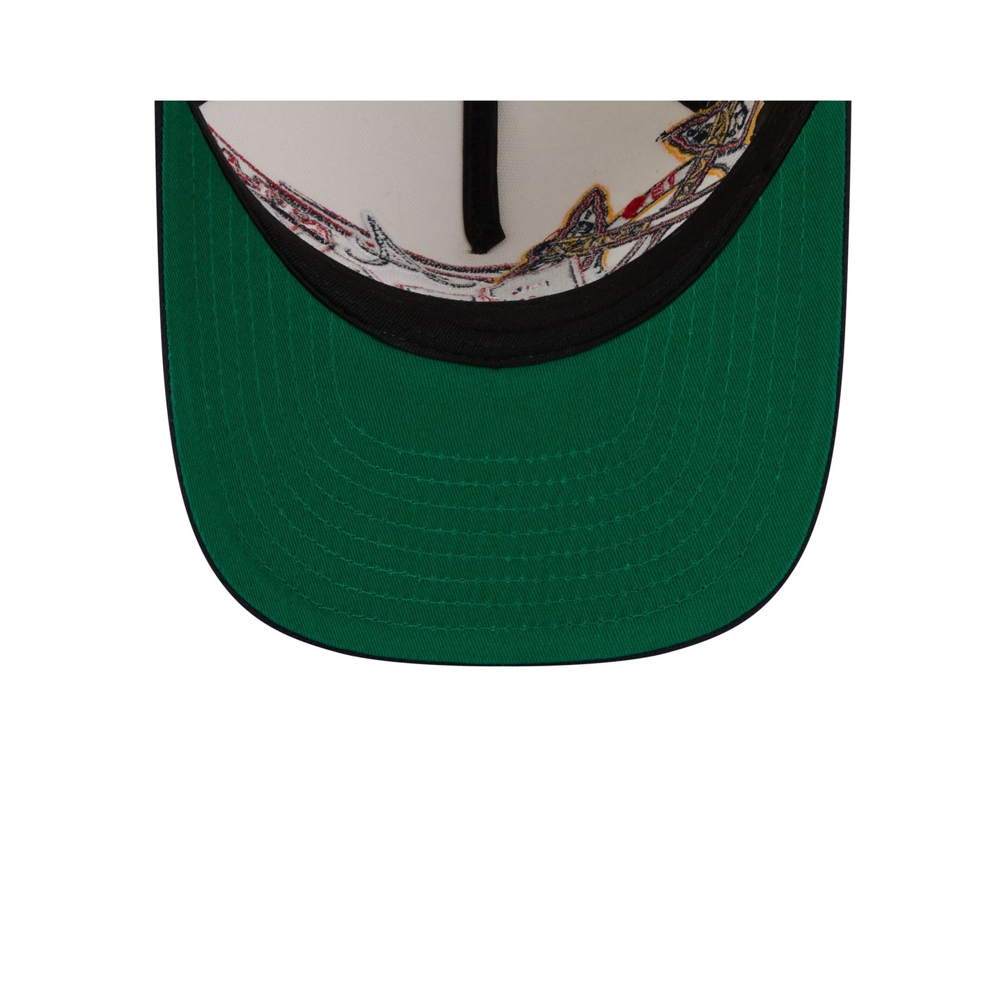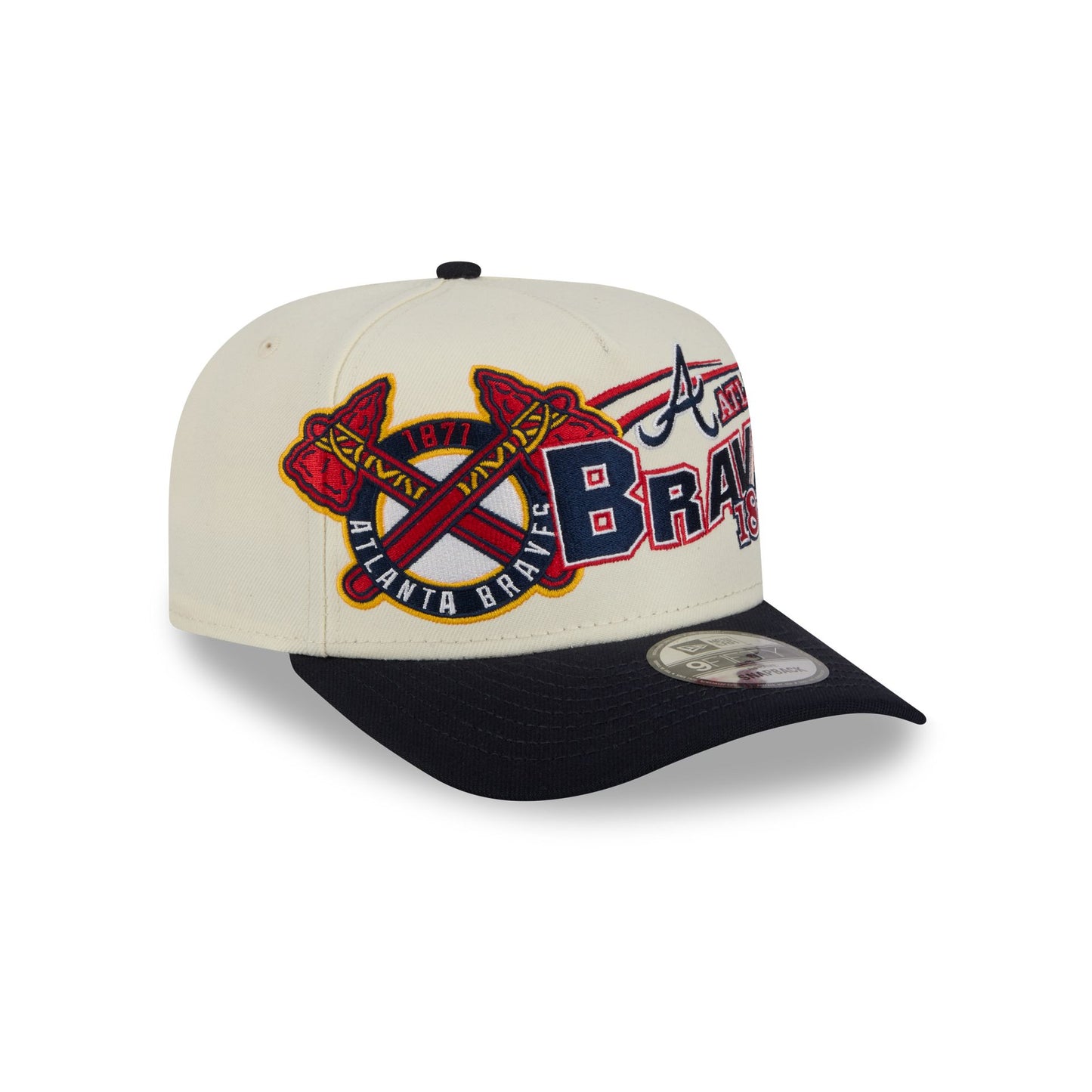 The Atlanta Braves Chrome White Classic 9FIFTY A-Frame Snapback features an embroidered Braves graphic at the front panels with an adjustable snapback closure at the rear and a green undervisor.