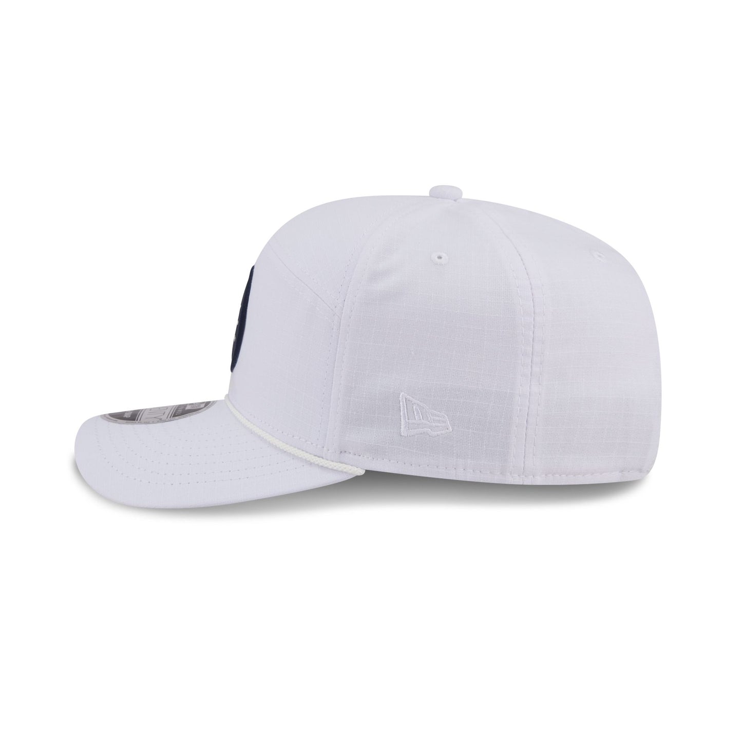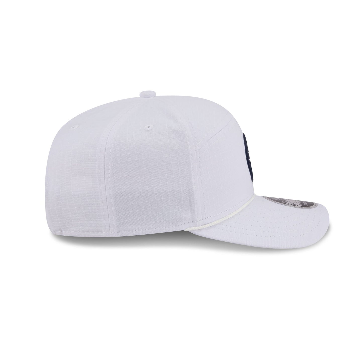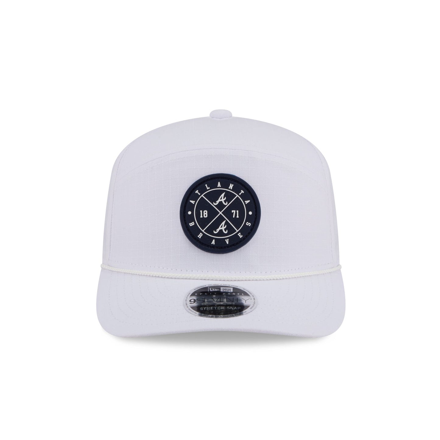 The Atlanta Braves Circle Logo White Split Panel 9SEVENTY Stretch-Snap features a woven silicone Braves circle logo at the front panel with a split crown construction and light-weight fabrication. Additional details include an adjustable stretch-snap closure at the rear and a gray undervisor.