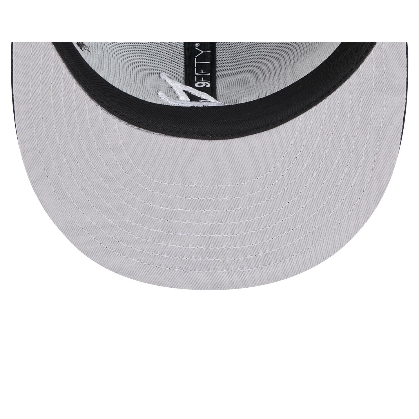 The Atlanta Braves City Art 9FIFTY Snapback features an embroidered Braves black and white logo at the front panels and an embroidered city banner with art at the right-wear side. Additional details include a snapback closure at the rear and a gray undervisor.