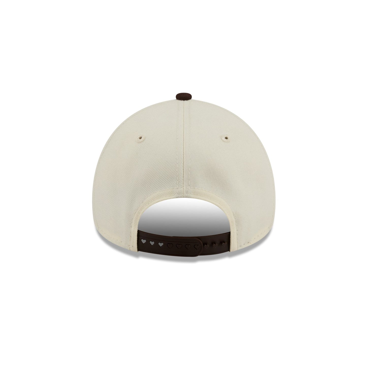 The Atlanta Braves City Script 9FORTY A-Frame Snapback features an embroidered Braves logo at the front panels with a city script at the right-wear side. Additional details include an adjustable heart-shaped snapback closure at the rear and a pink undervisor.