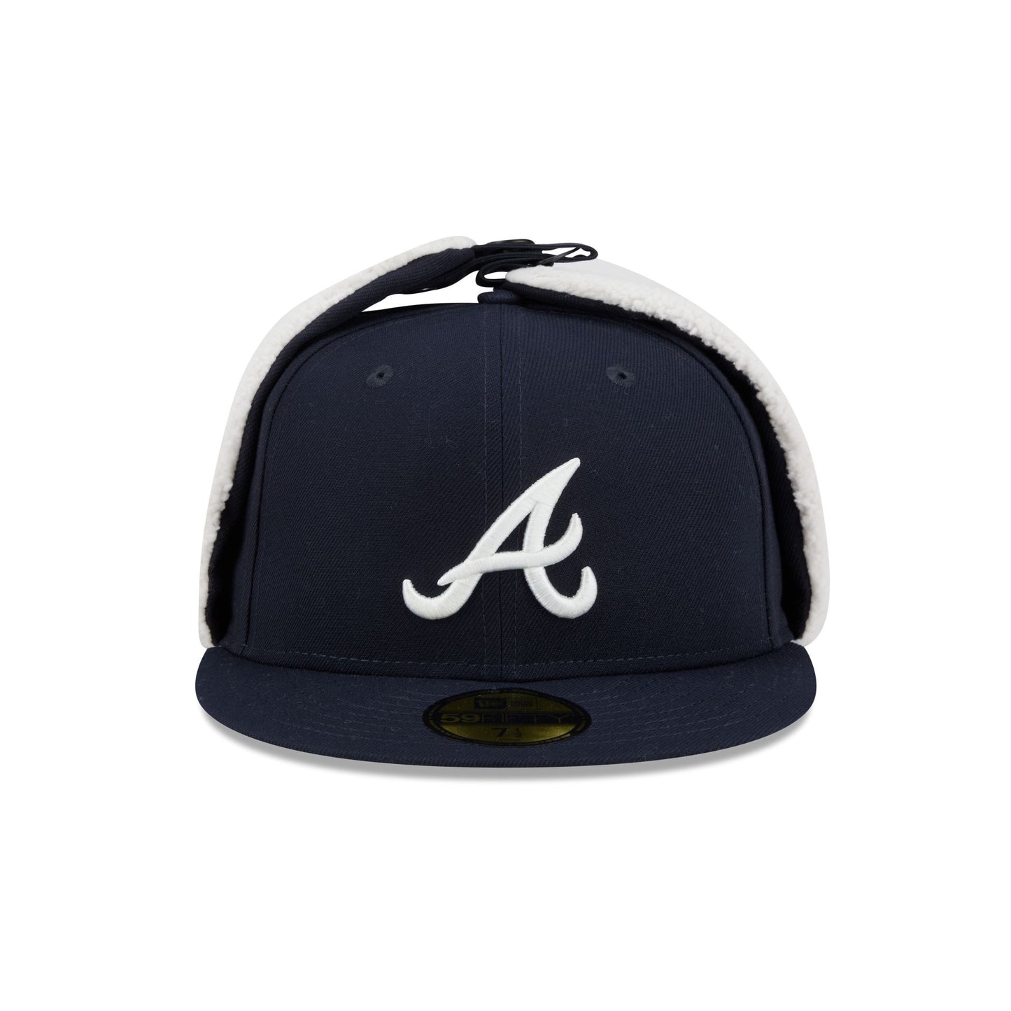 The Atlanta Braves Classic Dog Ear 59FIFTY Fitted Cap features an embroidered Braves logo at the front panels with sherpa ear covers with a snap button closure. Additional details include the MLB Batterman logo at the rear and a gray undervisor.