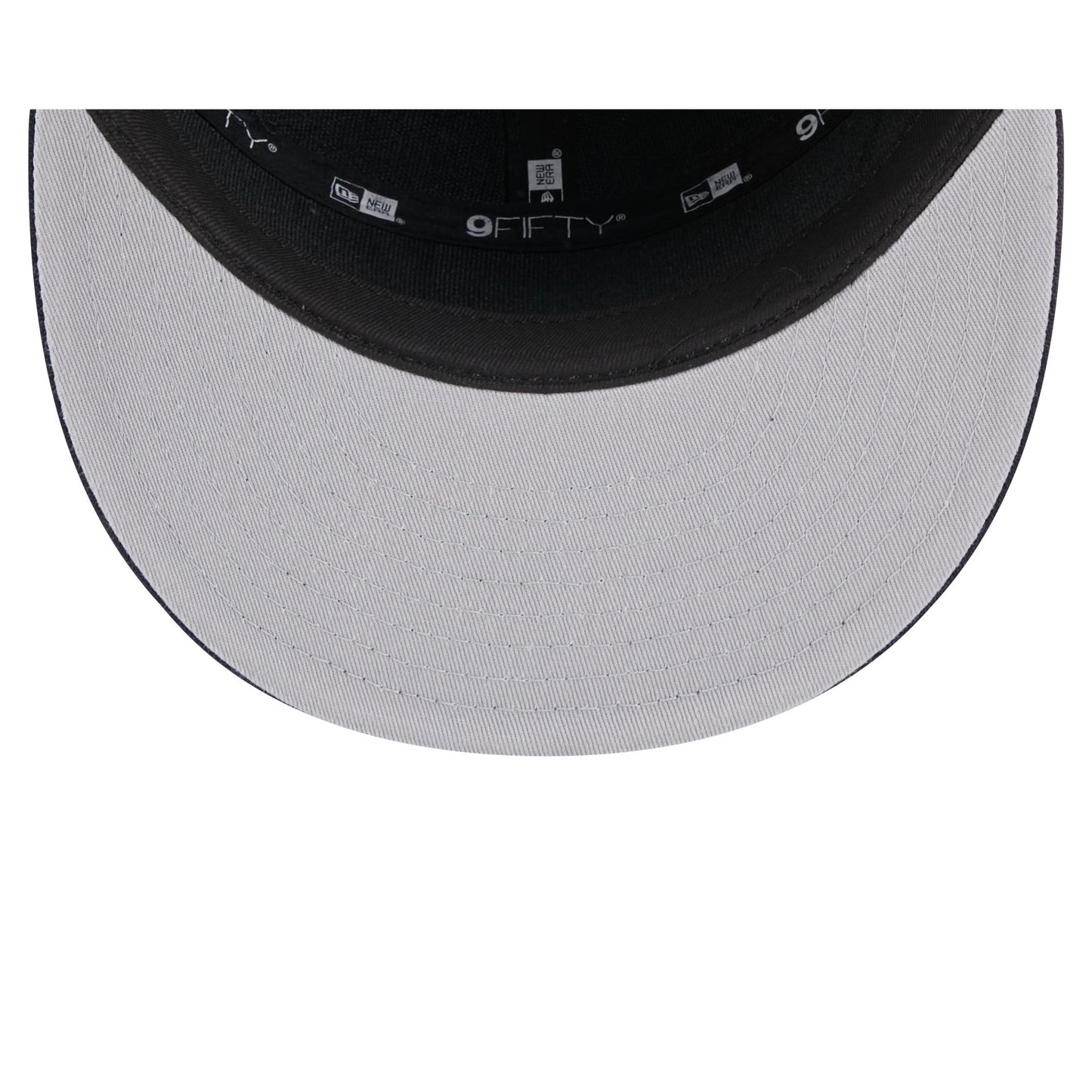 The Atlanta Braves Cotton Canvas 9FIFTY Split Panel Trucker Hat features an embroidered Braves logo at the front panels with an adjustable snapback closure at a mesh rear.