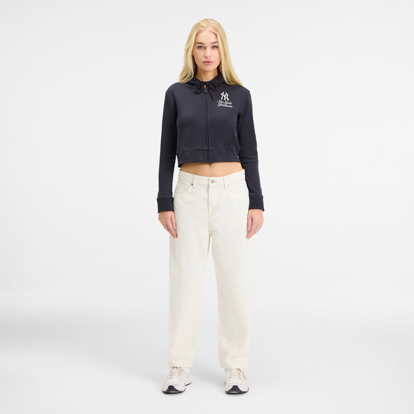 The Atlanta Braves Game Day Cropped Women's Zipper Hoodie features an embroidered Braves logo and script wordmark at the left chest. Additional details include a zipper closure, pockets, and adjustable drawstrings at the hood.