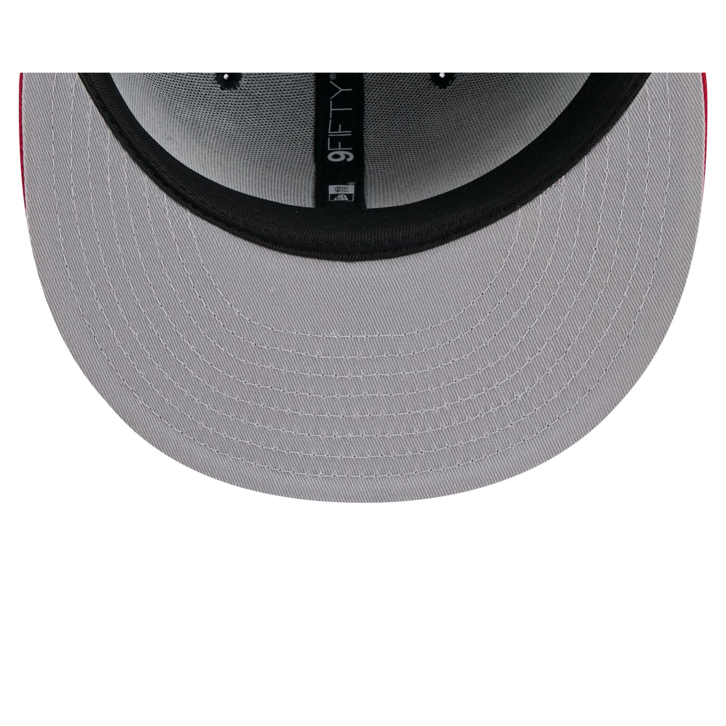 The Atlanta Braves Generation Mascots 9FIFTY Snapback features an embroidered Braves baby and adult mascot at the front panels. Additional details include a snapback closure at the rear and a gray undervisor.