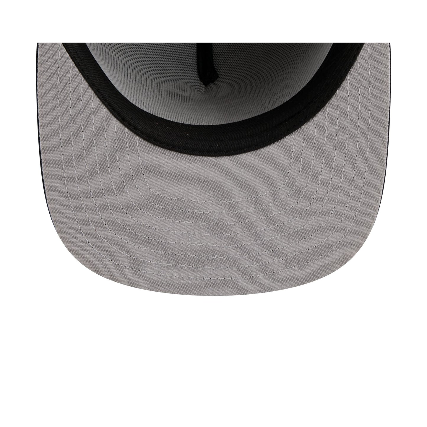 The Atlanta Braves Grunge Plaid 9FIFTY A-Frame Adjustable Cap features an embroidered Braves logo at the front panel with an alternative logo above an adjustable metal clasp closure at the rear, a black visor, and a gray undervisor.