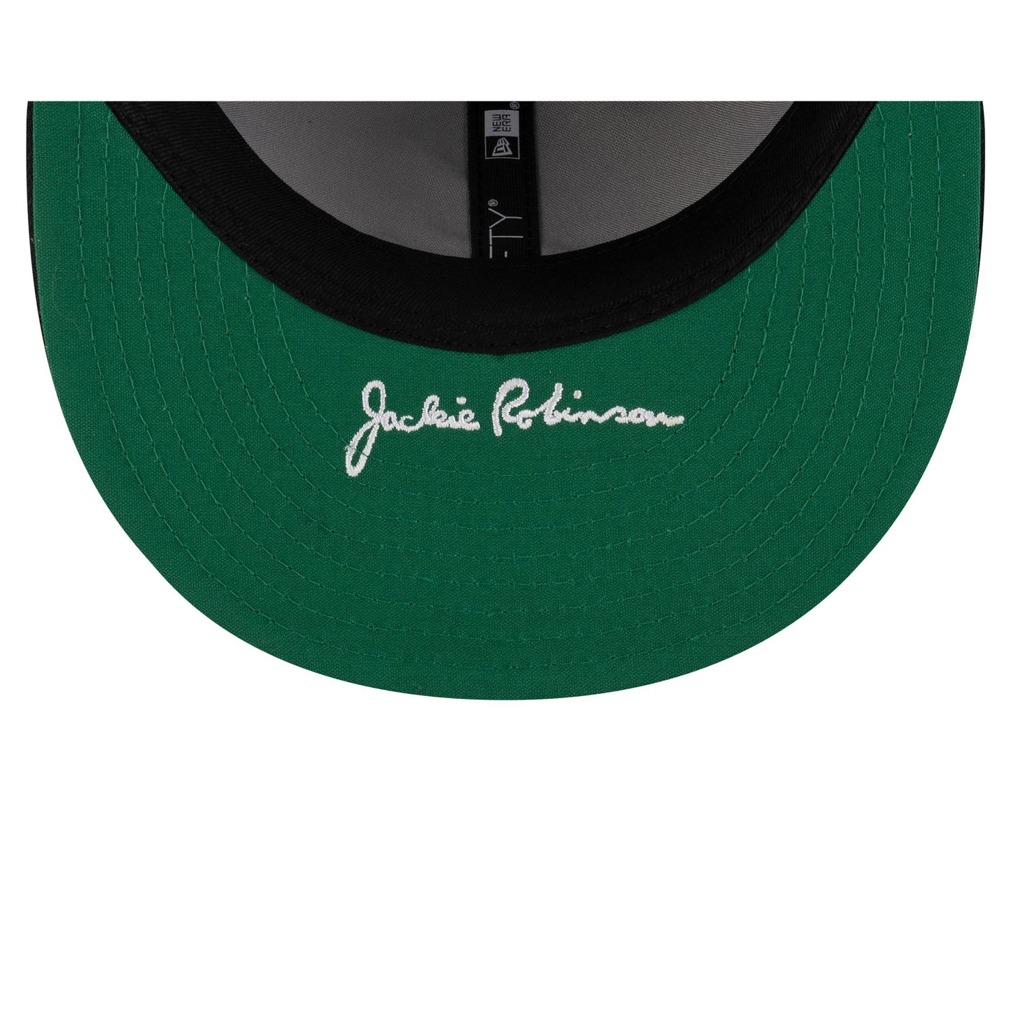 The Atlanta Braves Jackie Robinson Day 2025 Retro Crown 9FIFTY Snapback features an embroidered Braves logo at the front panels with an MLB Batterman logo above a snapback closure at the rear. Additional details include a Jackie Robinson pin at the left panel and Robinson's embroidered signature on a green undervisor.