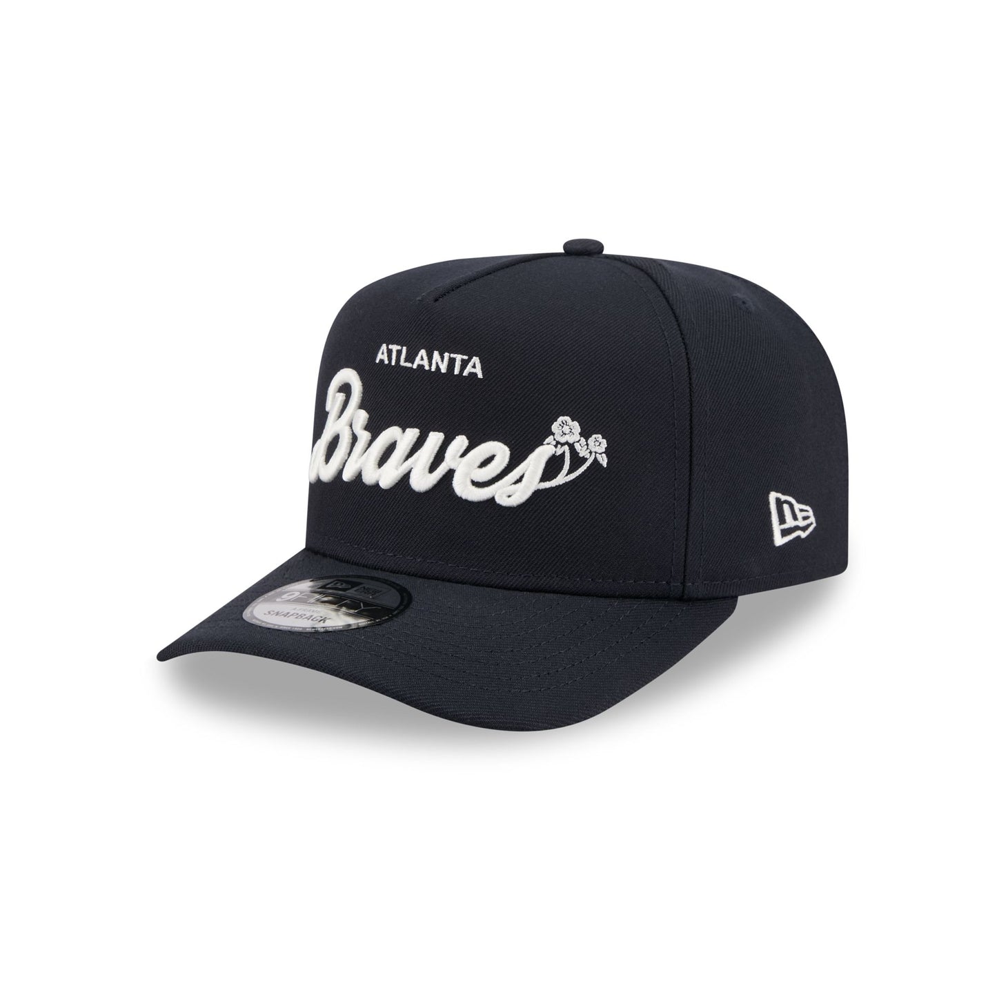 The Atlanta Braves Local Play 9FIFTY A-Frame Snapback features an embroidered Braves themed script wordmark at the front panels with a logo at the right-wear side. Additional details include an adjustable snapback closure at the rear and a gray undervisor.