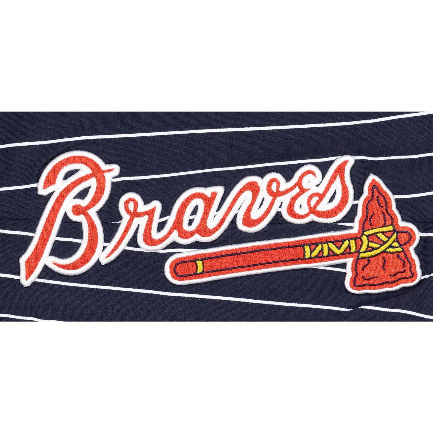 The Atlanta Braves Logo Select Pinstripe Jogger features a chenille applique Braves logo and embroidered wordmark at the left leg with an alternate team logo at the right ankle.