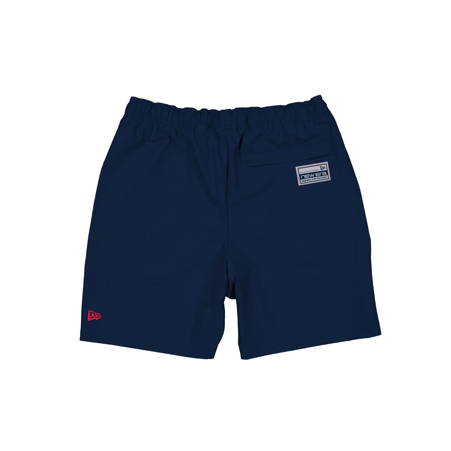 The Atlanta Braves Match Day Navy Shorts feature a silicone-print Braves wordmark at the right leg and screen-printed logos and graphics down the left leg. Additional details include front pockets, adjustable drawstrings at the waist, and a New Era jock tag at the rear.