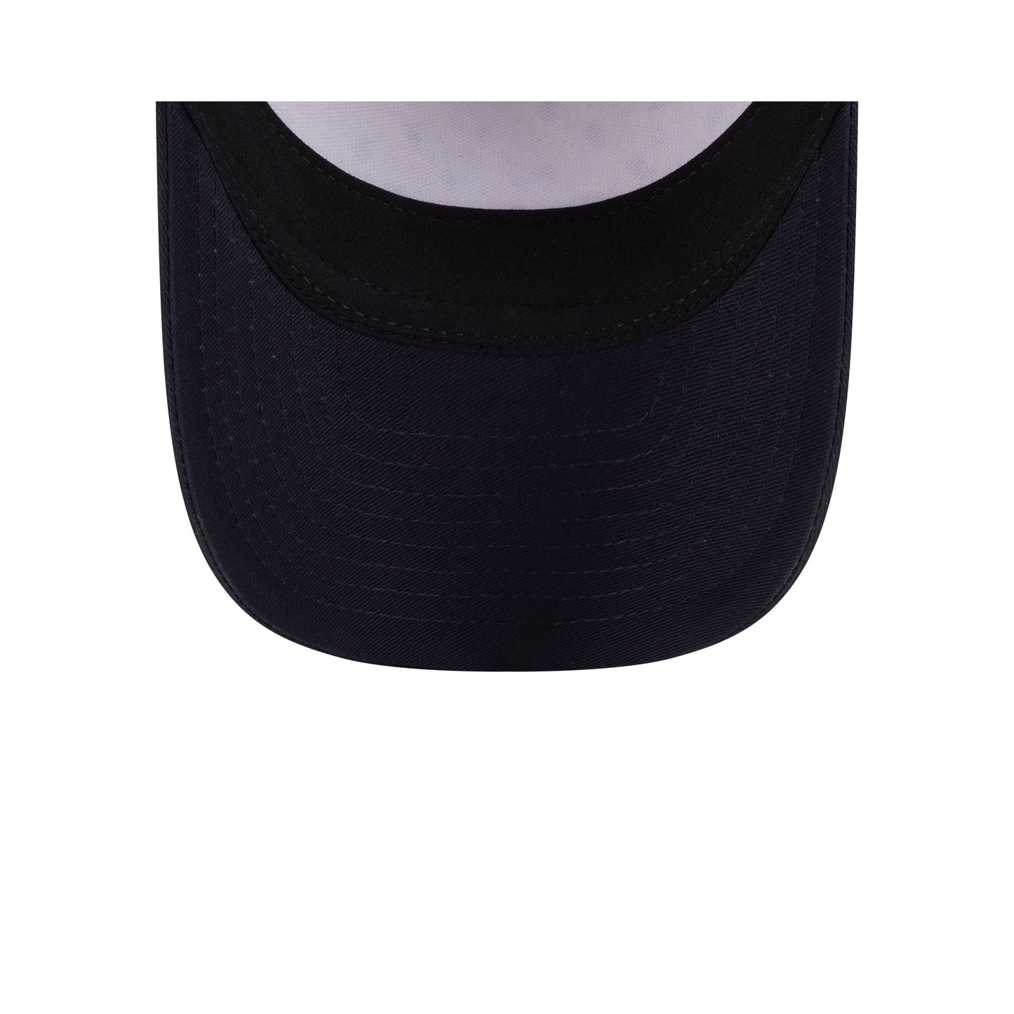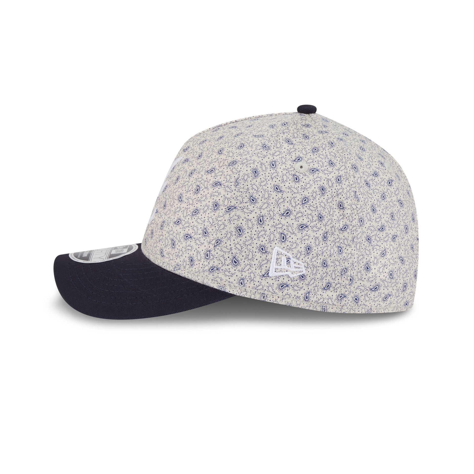 The Atlanta Braves Micro Print 9FORTY M-Crown A-Frame Adjustable Cap features an embroidered Braves logo at the front panels against a specialty Japanese milled woven fabric from Three Looms Japan Fabrics.. Additional details include an adjustable D-Ring closure at the rear.