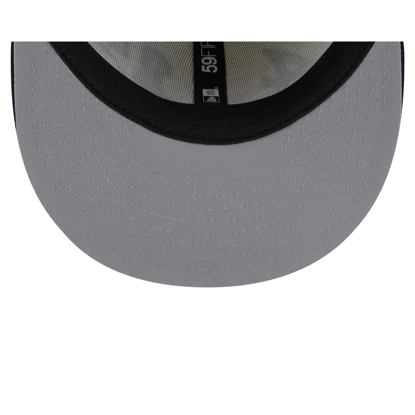 The Atlanta Braves Ronald Acuña Jr. Chrome White 59FIFTY Fitted Cap features an embroidered Braves logo at the right panel and the player's signature and number at the right. Additional details include an MLB Batterman logo at the rear and a gray undervisor.