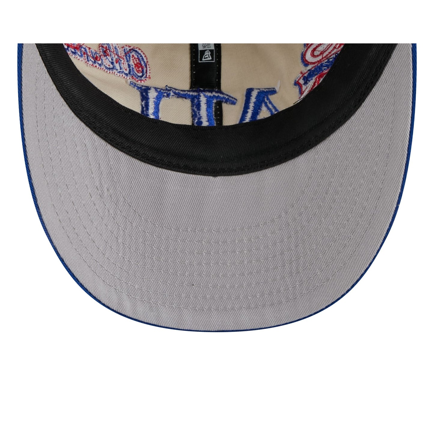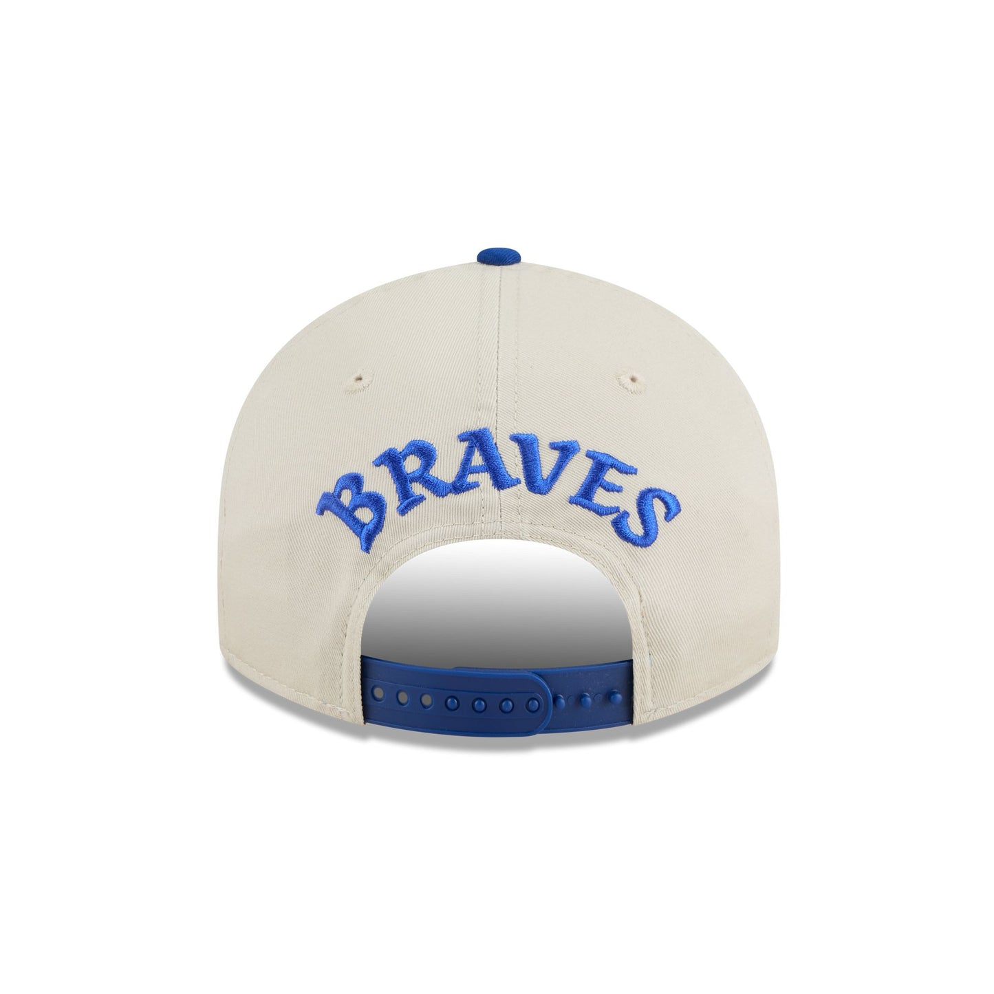 The Atlanta Braves Scattered Patches Retro Crown 9FIFTY Snapback features an embroidered Braves city abbreviation with multiple team logos and patches at the front panels. Additional details include a team wordmark above a snapback closure at the rear with a team color visor and a gray undervisor.