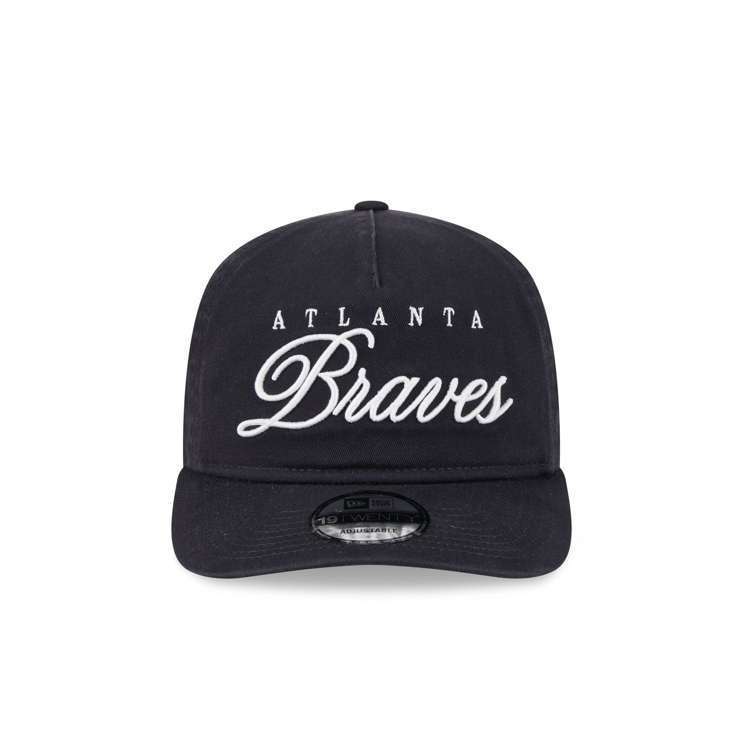 The Atlanta Braves Scripted 19TWENTY Adjustable Cap features an embroidered Braves script wordmark at the front panels with a team logo at the right-wear side. Additional details include an adjustable snapback closure at the rear and a gray undervisor.