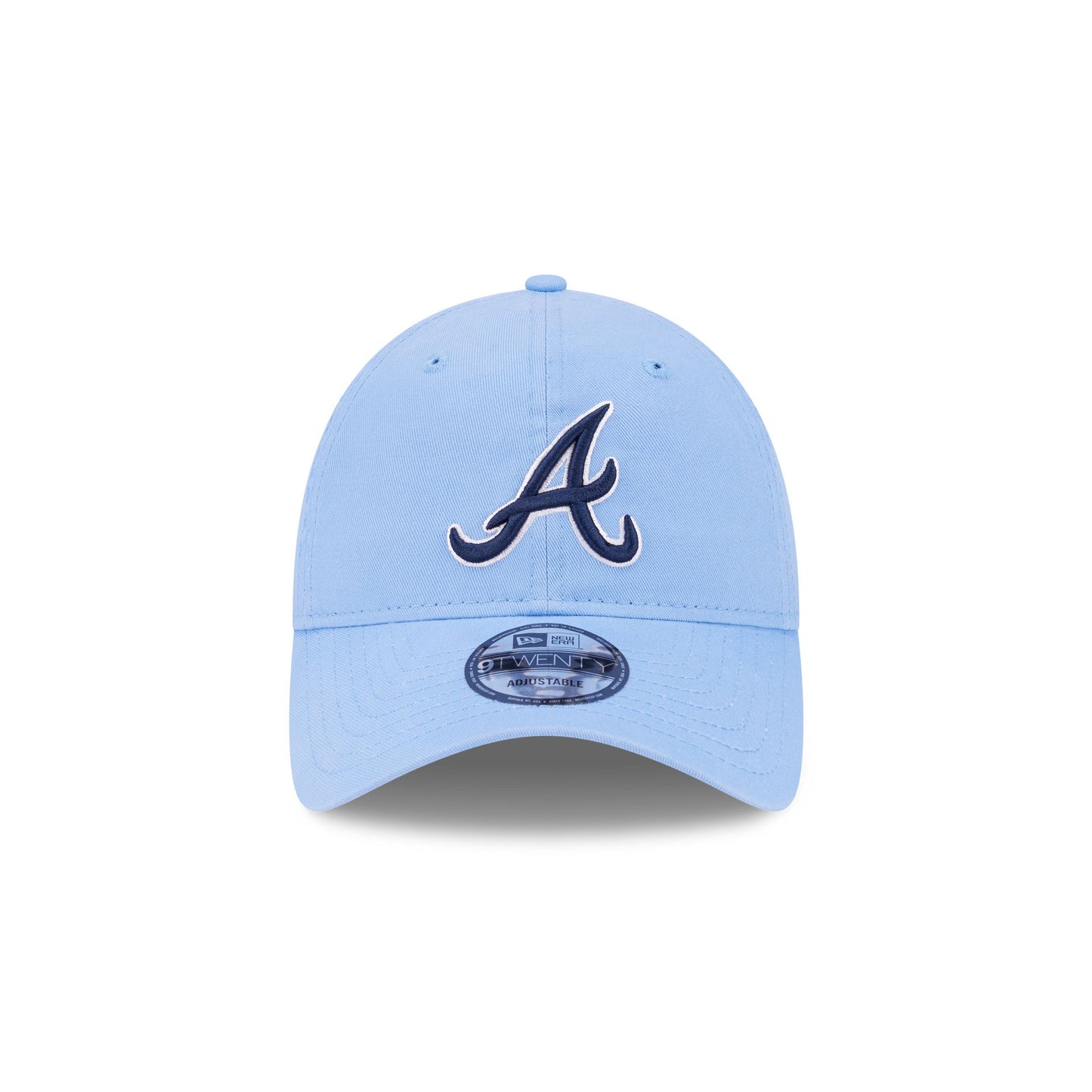 The Atlanta Braves Sky Blue 9TWENTY Adjustable Cap features an embroidered Braves logo at the front panels with a matching woven team logo tag at the adjustable D-Ring closure at the rear.