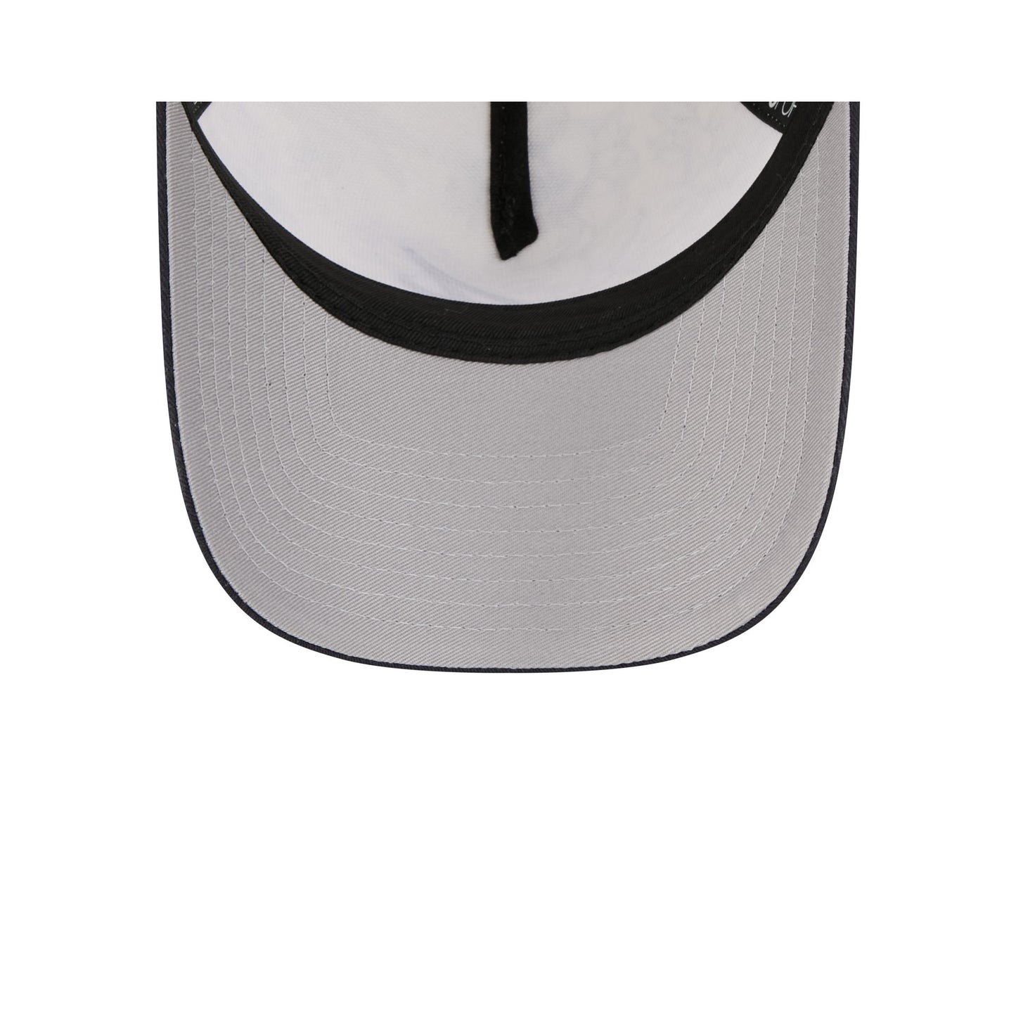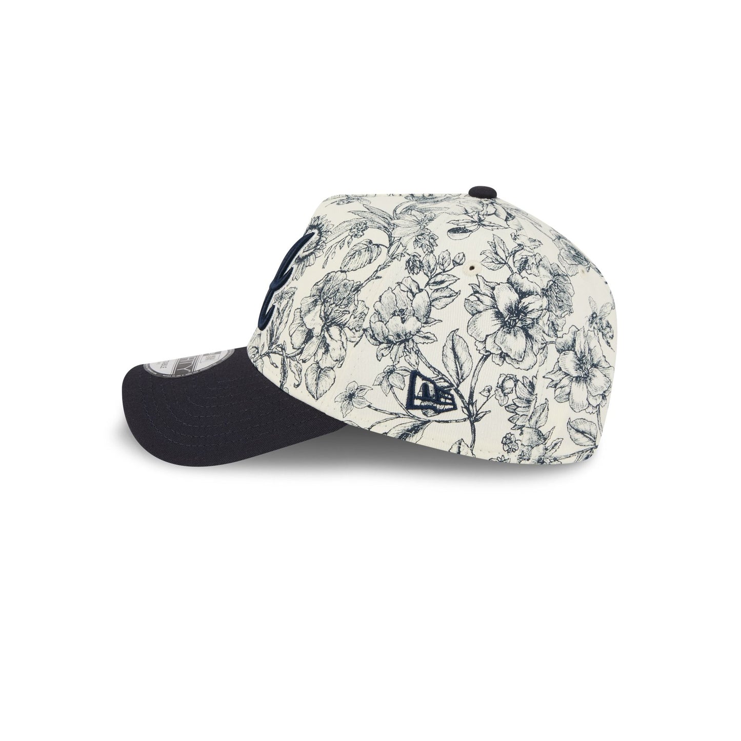 The Atlanta Braves Spring Floral Navy 9FORTY A-Frame Snapback features an embroidered Braves logo at the front panel with a floral print cotton twill all over fabrication, an adjustable snapback closure at the rear, a navy visor, and a gray undervisor.
