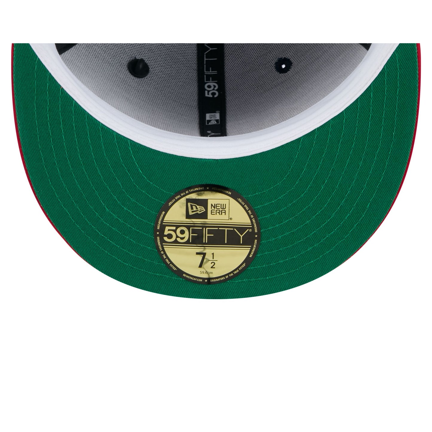 The Atlanta Braves Spring Satin 59FIFTY Fitted Cap features an embroidered Braves wordmark at the front panels with a New Era pin at the top left panel and an MLB Batterman logo at the rear. Additional details include a satin fabrication throughout, a logo at the right-wear side, and a green undervisor.