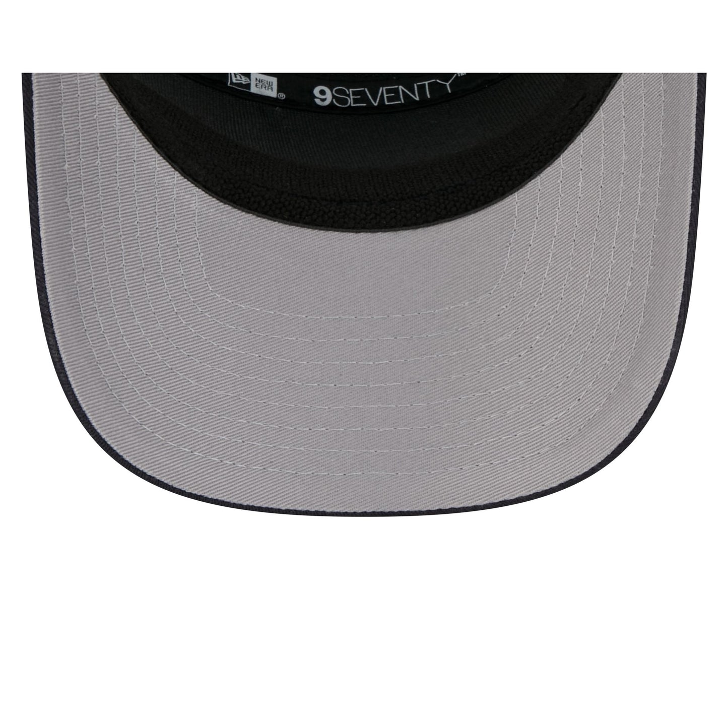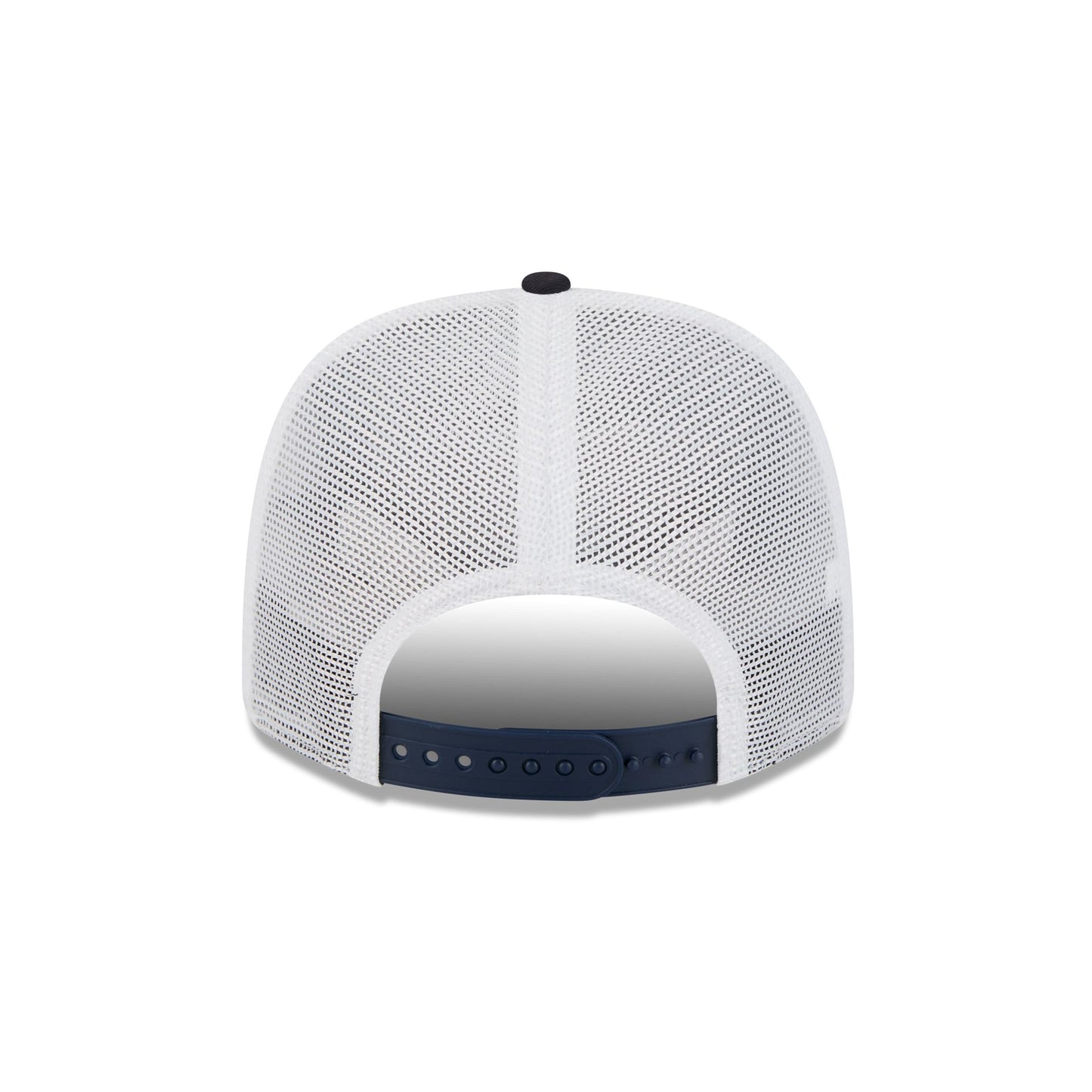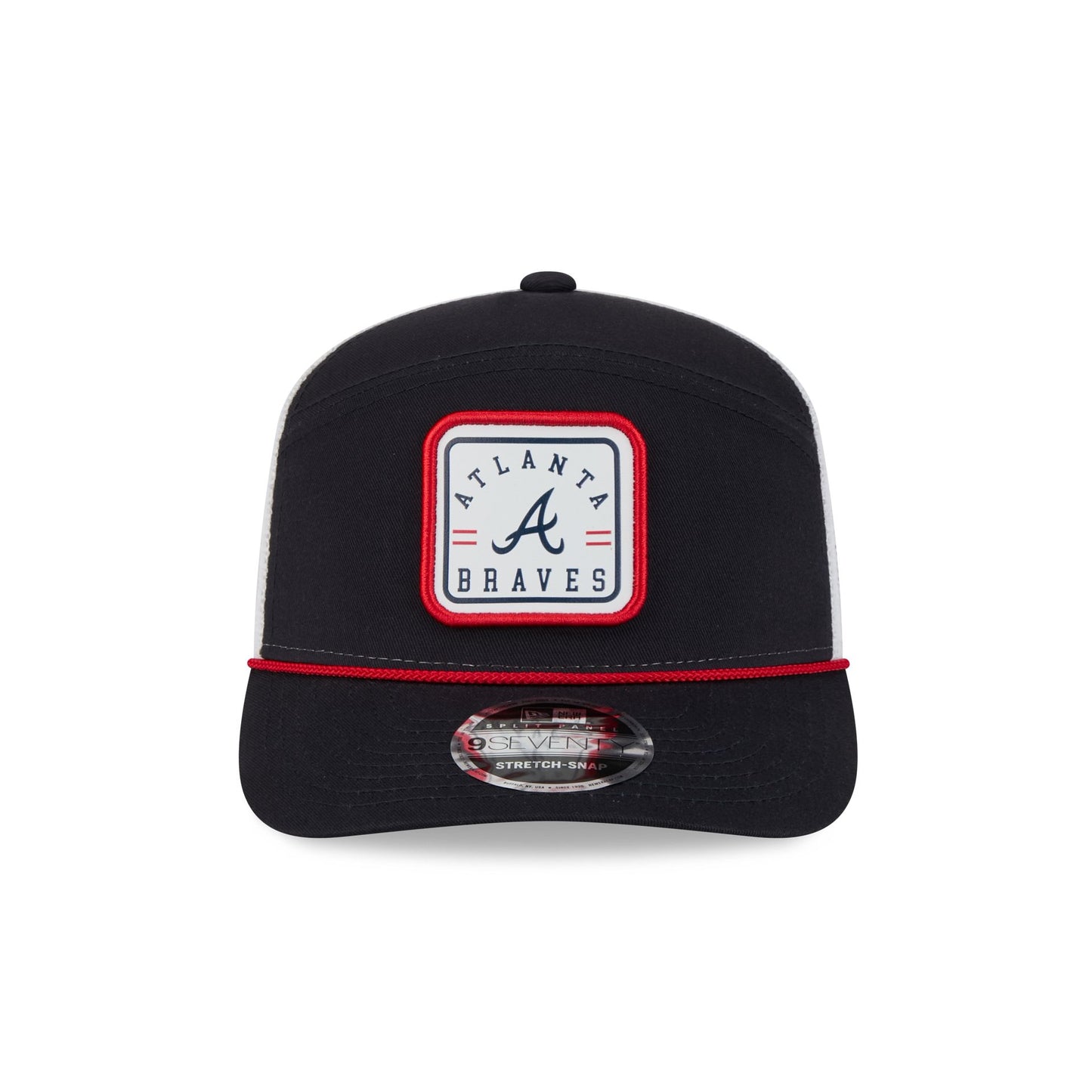 The Atlanta Braves Square Patch Split Panel 9SEVENTY Trucker features an embroidered Braves square patch at the front panel with a split crown construction and a rope at the visor. Additional details include an adjustable stretch-snap closure at a mesh rear and a gray undervisor.