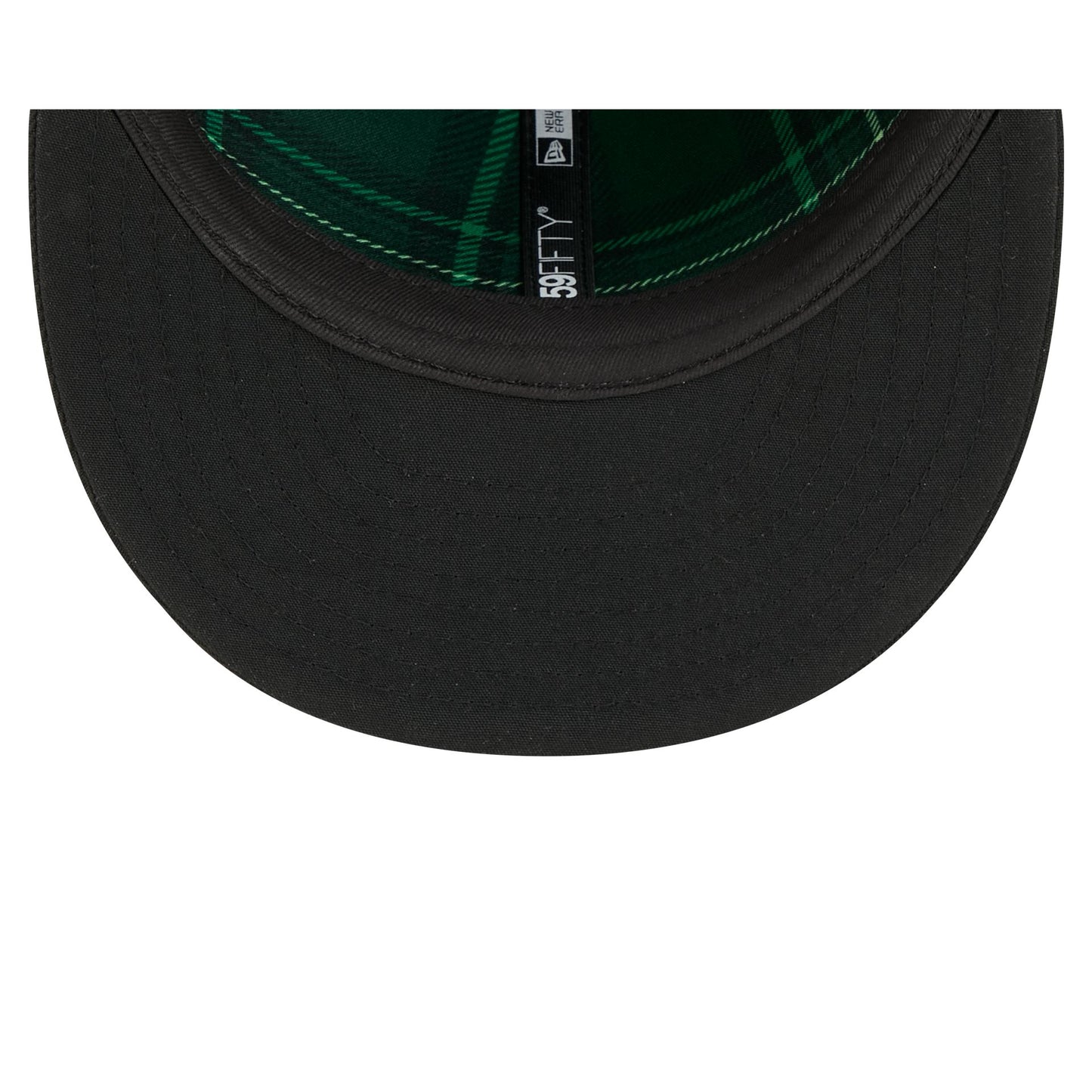 The Atlanta Braves St. Patrick's Day 2026 59FIFTY Fitted Cap features a green and gold embroidered Braves logo at the front panels with a matching MLB Batterman logo at the rear and a mini shamrock at the top right. Additional details include a team wordmark over a metallic green shamrock baseball diamond patch at the right-wear side with a green plaid interior fabrication at the front panels.