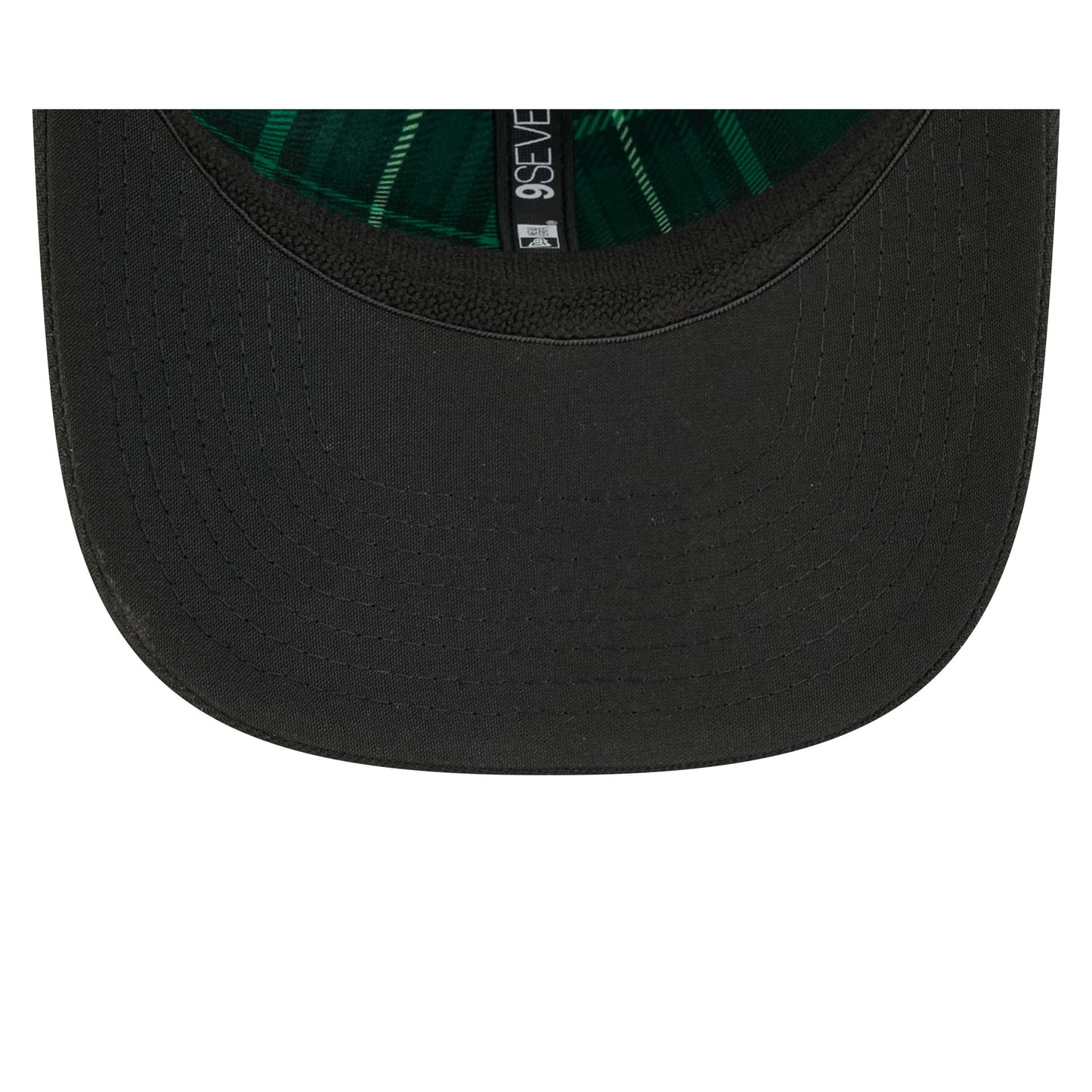 The Atlanta Braves St. Patrick's Day 2026 9SEVENTY Stretch-Snap Cap features a green and gold embroidered Braves logo at the front panels with a matching MLB Batterman logo and mini shamrock above a stretch-snap closure at the rear. Additional details include a team wordmark over a metallic green shamrock baseball diamond patch at the right-wear side with a green plaid interior fabrication at the front panels.