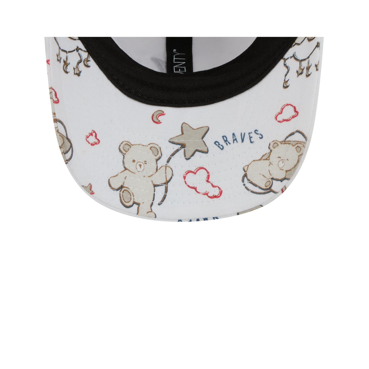 The Atlanta Braves Teddy Kids 9TWENTY Adjustable cap features an embroidered Braves logo at the front panels with a teddy bear pattern throughout and an elastic strap at the rear.