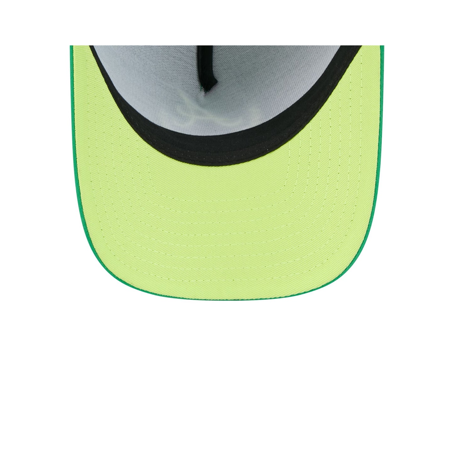 The Atlanta Braves Tee Time 9FORTY M-Crown A-Frame Snapback features an embroidered Braves golf logo at the front panels with a snapback closure at the rear and a neon green undervisor.