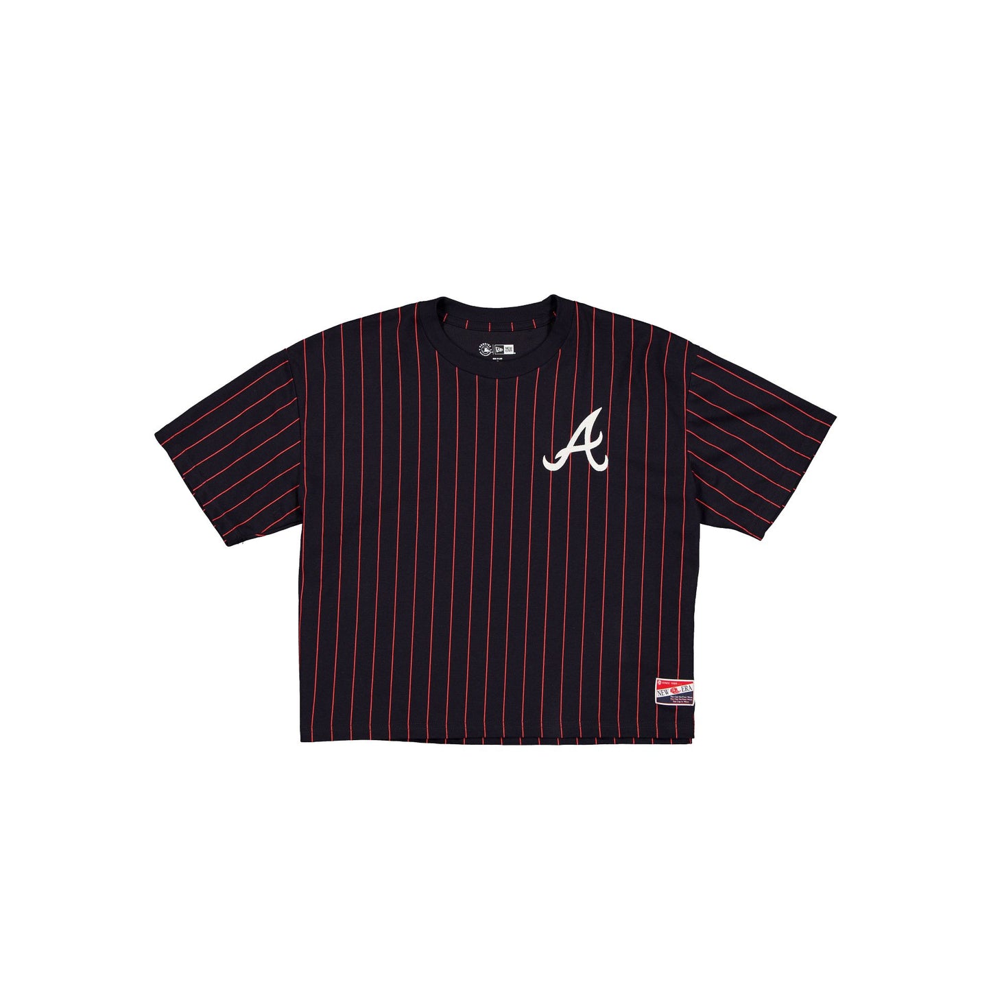 The Atlanta Braves Throwback Women's Cropped Pinstripe T-Shirt features an embroidered Braves logo at the left chest.