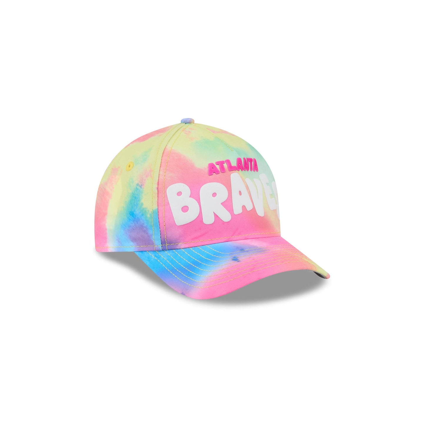 The Atlanta Braves Tie Dye Kids 9FORTY M-Crown A-Frame Snapback features a puff print Braves wordmark at the front panels with a tie dye fabrication throughout. Additional details include and adjustable snapback closure at the rear and a gray undervisor.