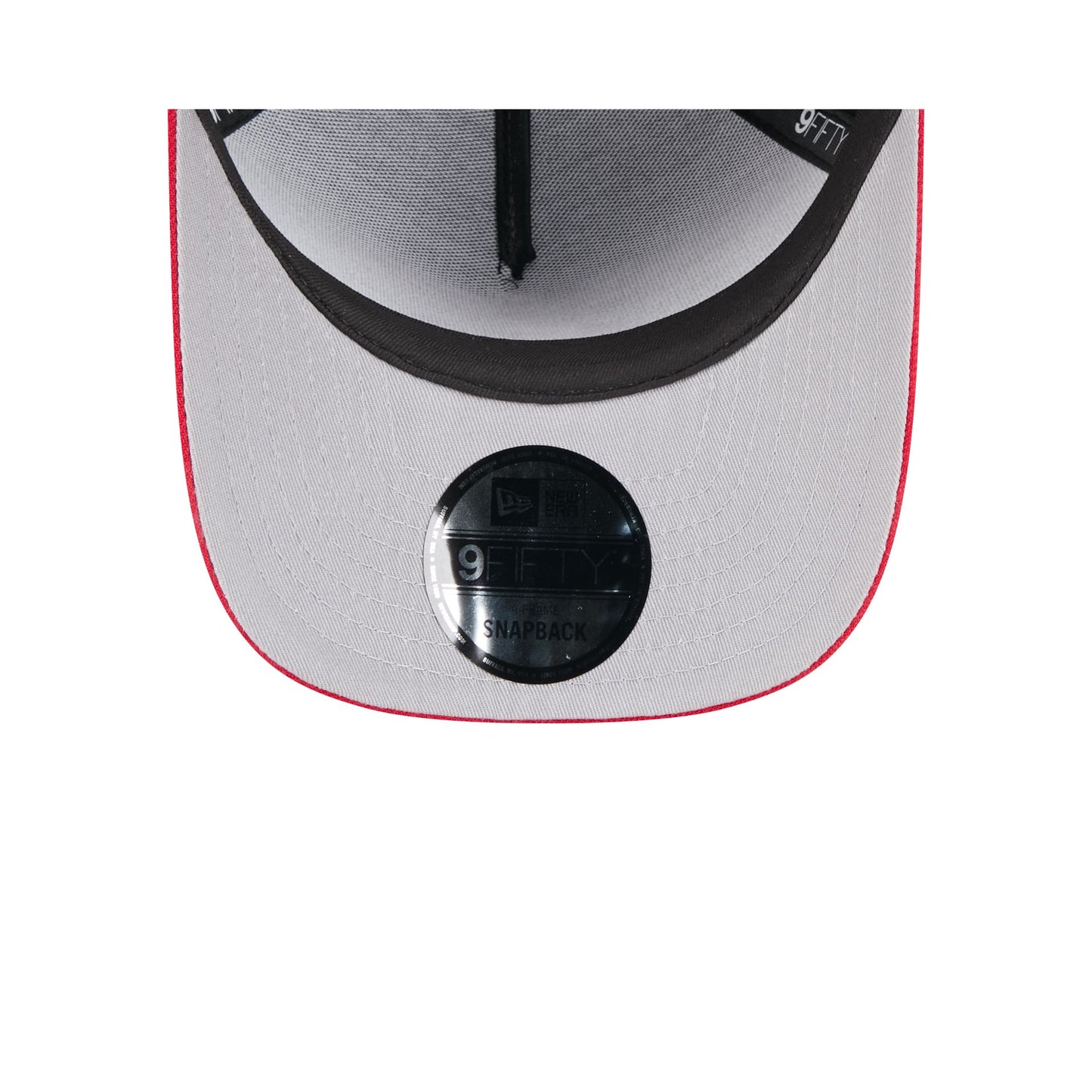 The Atlanta Falcons 2025 Draft 9FIFTY A-Frame Snapback features an embroidered Falcons logo and wordmark at the front panels with an NFL Shield logo above a snapback closure at the rear. Additional details include ornamental stitched details at the visor and a gray undervisor.