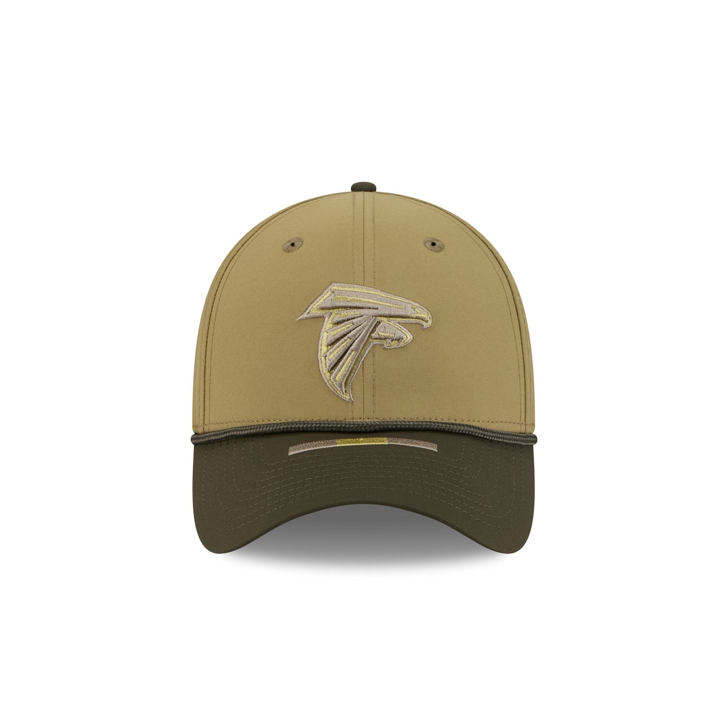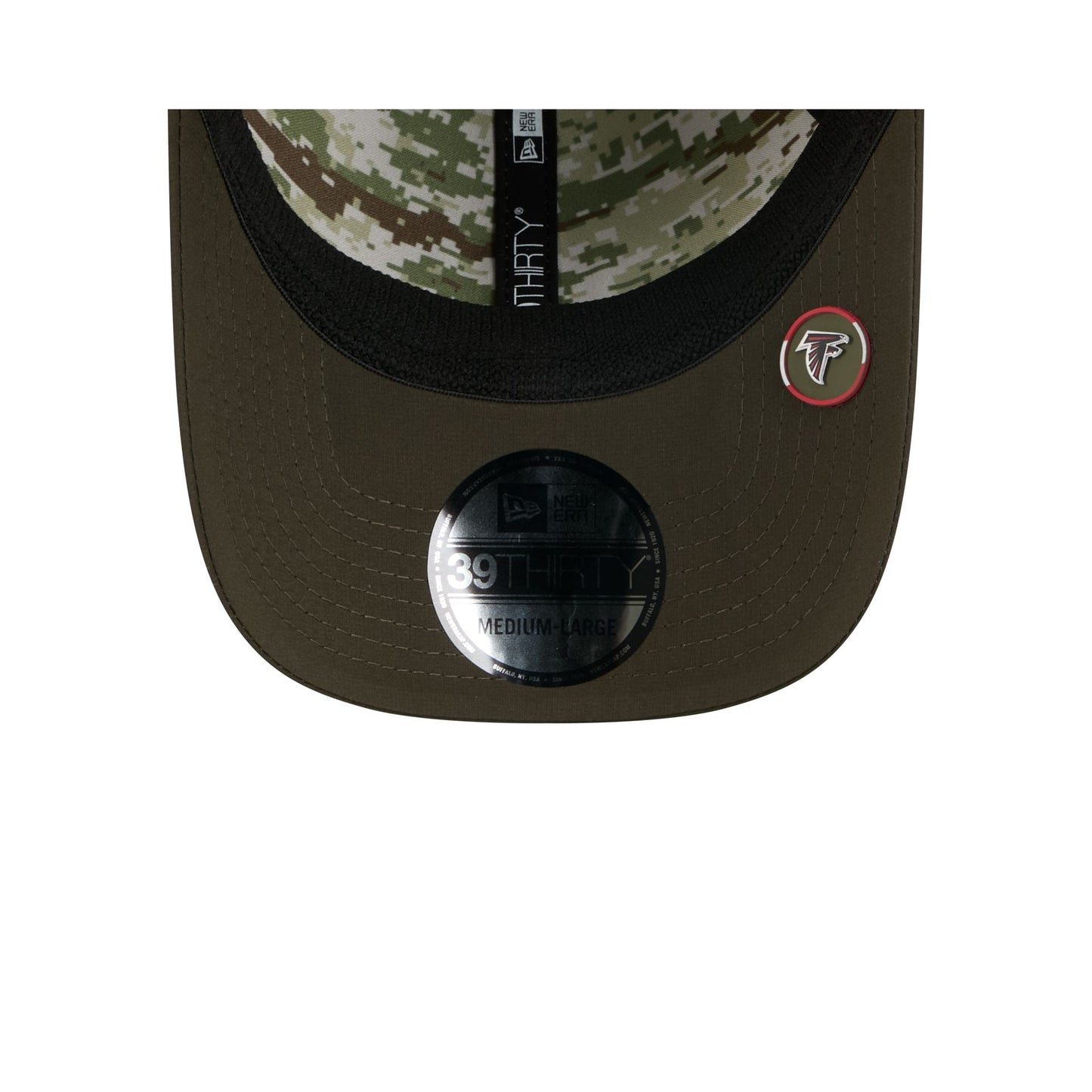 The Atlanta Falcons 2025 Salute to Service 39THIRTY Stretch Fit Cap features an embroidered Falcons logo at the front panels with the official NFL Salute to Service patch at the rear and an American flag patch at the right-wear side. Additional details include three green stripes at the visor with a silicone team logo patch at a dark green undervisor and a digi camo interior fabrication.