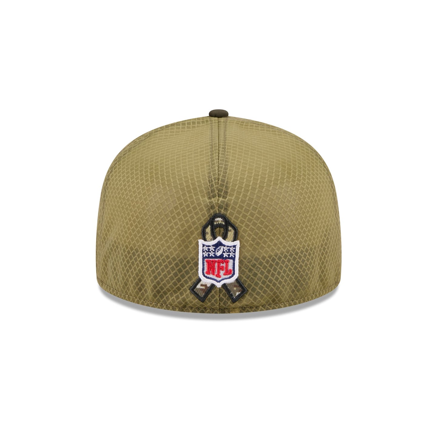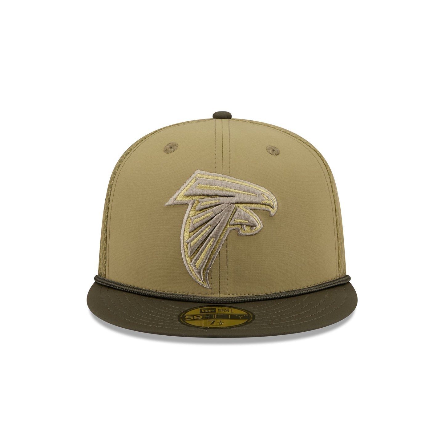 The Atlanta Falcons 2025 Salute to Service 59FIFTY Fitted Cap features an embroidered Falcons logo at the front panels with the official NFL Salute to Service patch at the rear mesh panels. Additional details include an American flag patch at the right-wear side with a silicone team logo patch at a dark green undervisor and a digi camo interior fabrication.