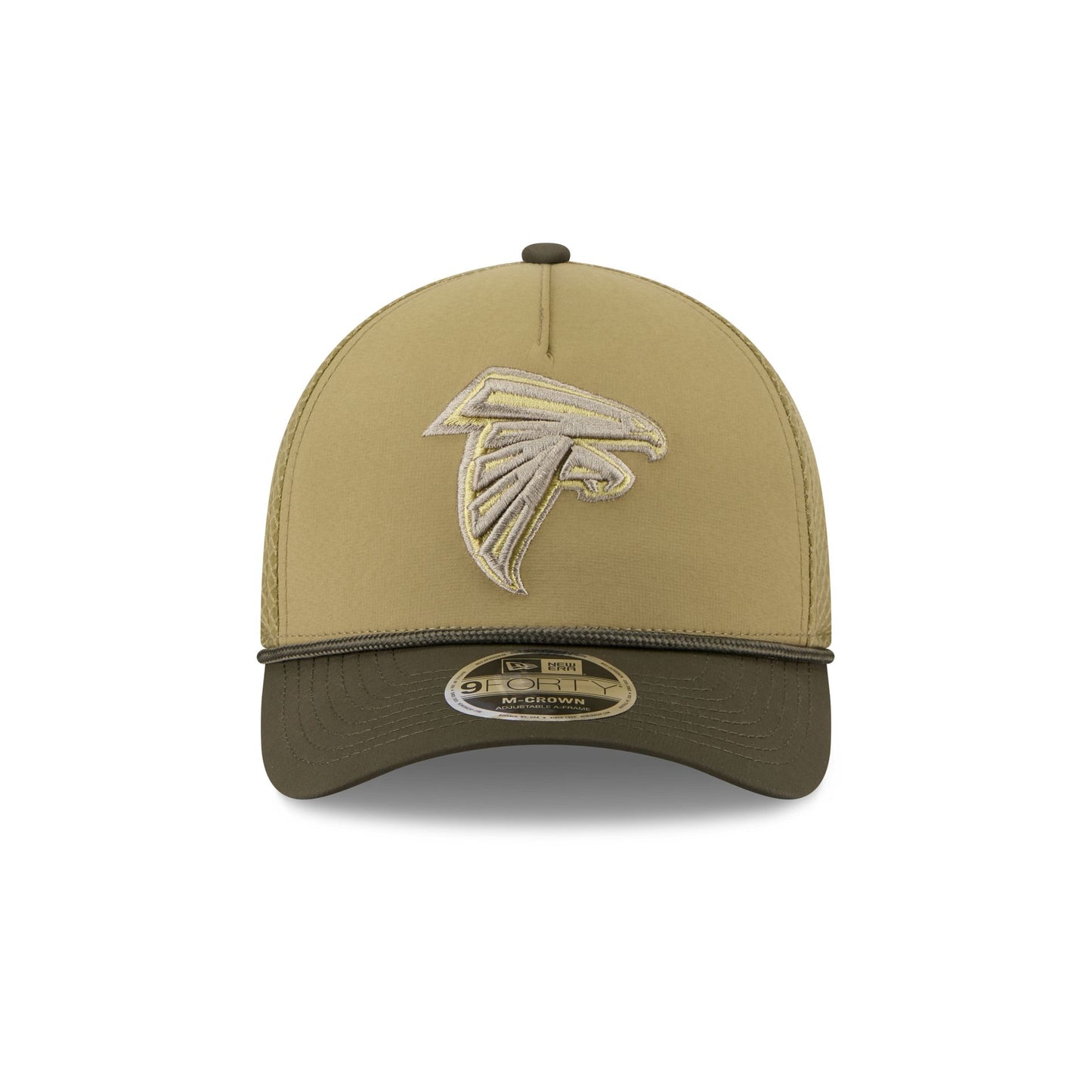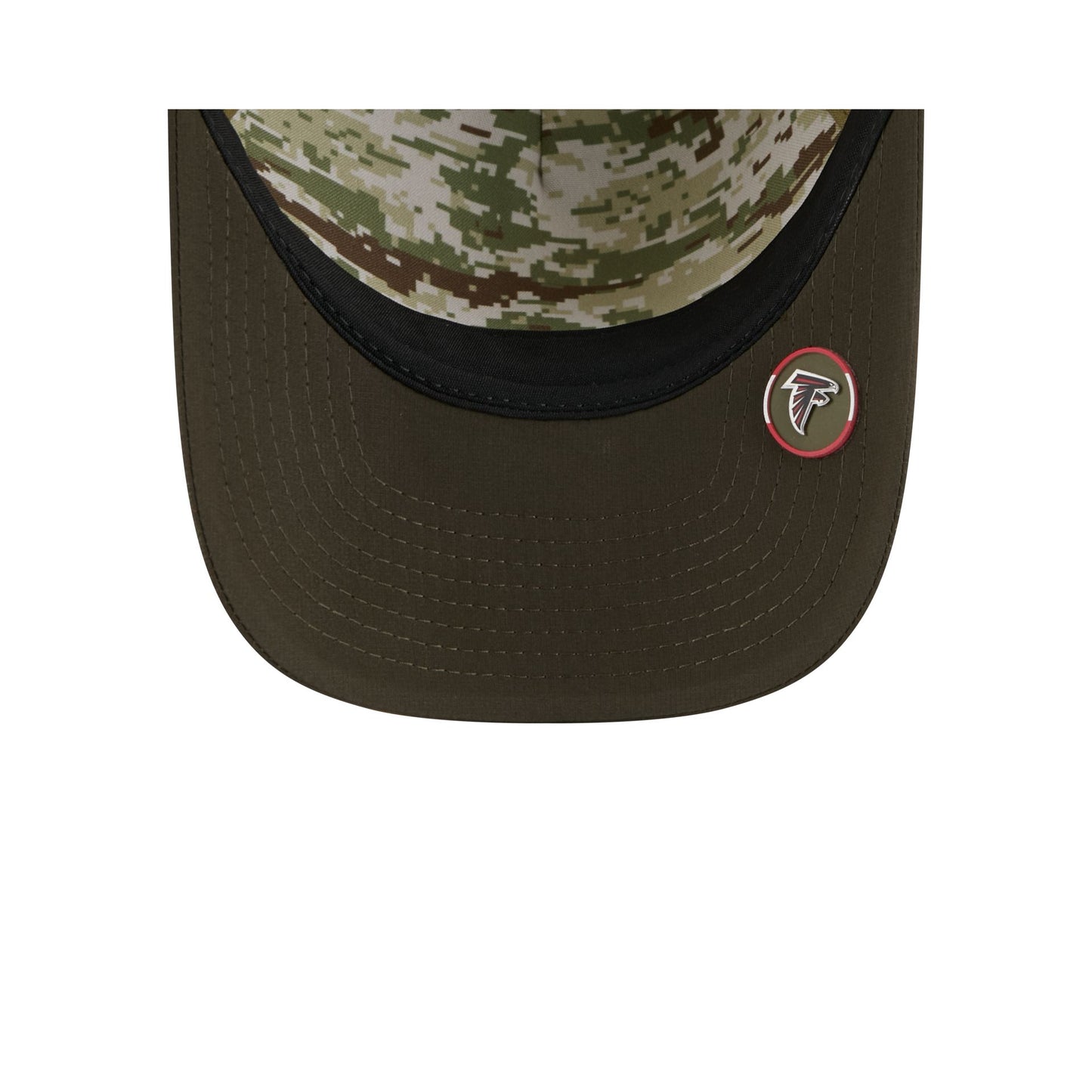 The Atlanta Falcons 2025 Salute to Service 9FORTY M-Crown A-Frame Trucker features an embroidered Falcons logo at the front panel with the official NFL Salute to Service patch above a snapback closure at the rear. Additional details include an American flag patch at the right-wear side with a silicone team logo patch at a dark green undervisor and a digi camo interior fabrication.