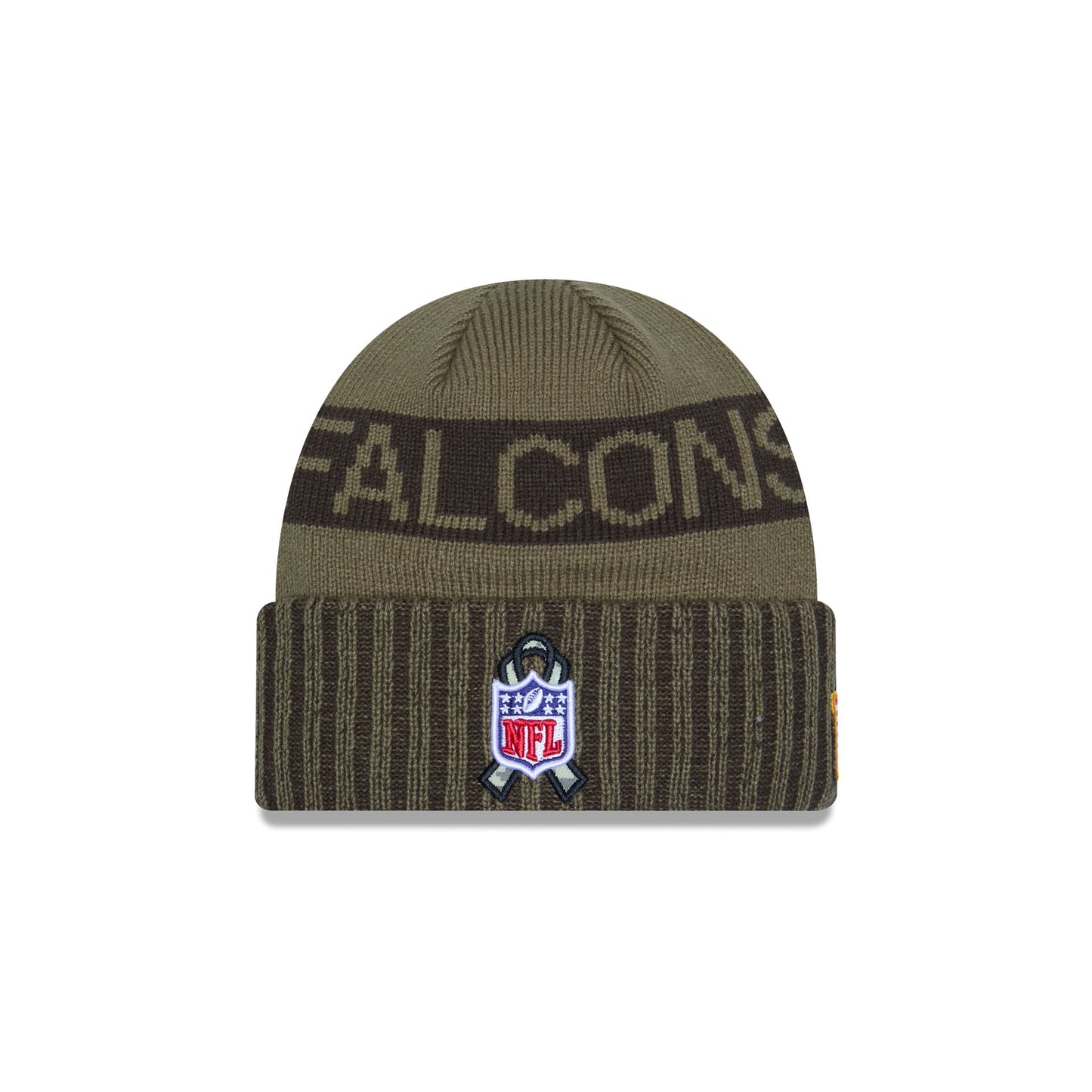 The Atlanta Falcons 2025 Salute to Service Cuff Knit features an embroidered Falcons logo at the front with a team wordmark at the crown, an American flag patch at the right-wear side, and the official NFL Salute to Service patch at the rear.