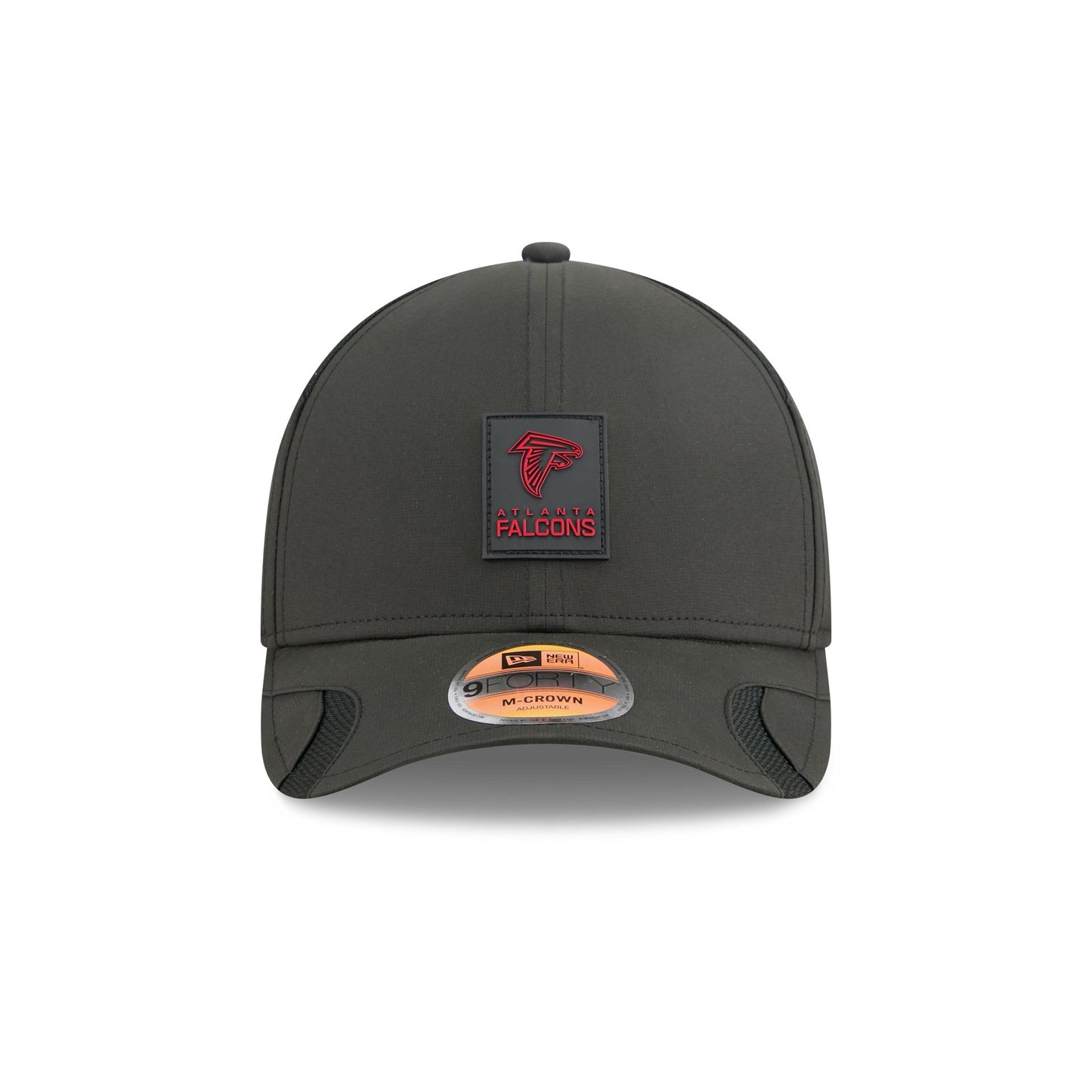 The Atlanta Falcons 2025 Sideline Hot Weather 9FORTY M-Crown Snapback features a sewn-down silicone Falcons logo patch at the front panels with a water-repellent quill tech fabrication throughout and a quick-dry cushioned sweatband to absorb moisture. Additional details include the Official NFL Shield logo to the right of a soft silicone snapback closure at the rear and mesh accents at the visor sides and side crown panels. The undervisor is accented with a silicone transfer in the team’s colors.