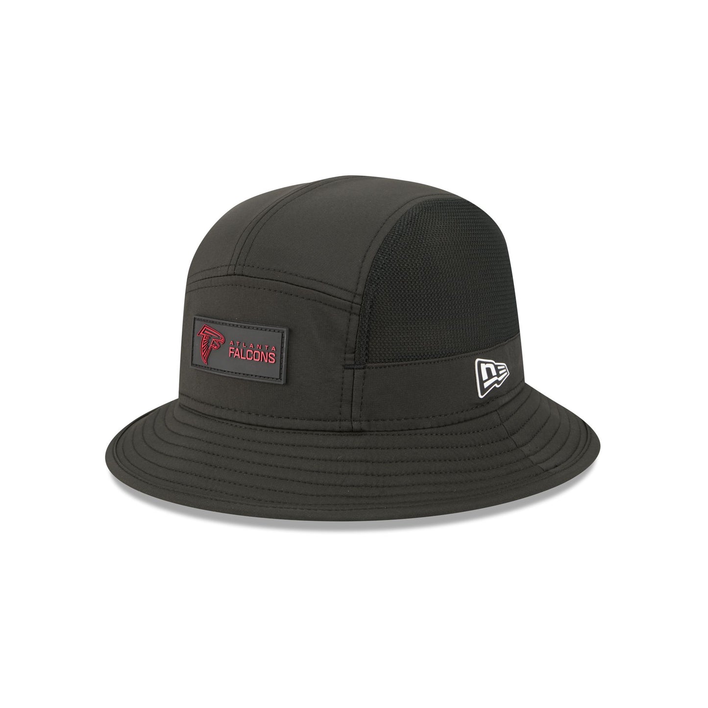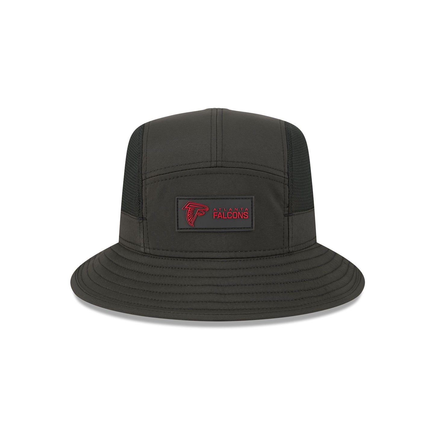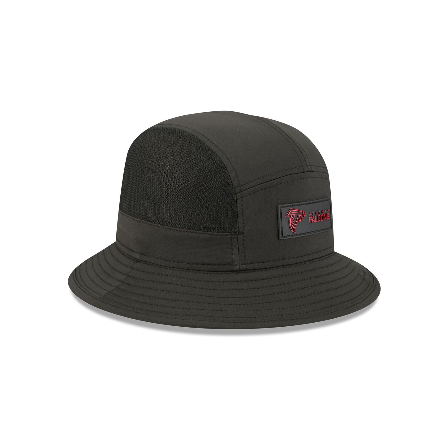 The Atlanta Falcons 2025 Sideline Hot Weather Bucket Hat features a sewn-down silicone Falcons logo patch at the front with the Official NFL Shield logo at the right-wear side. Additional details include breathable mesh side panels and an adjustable reflective drawstring at the rear.