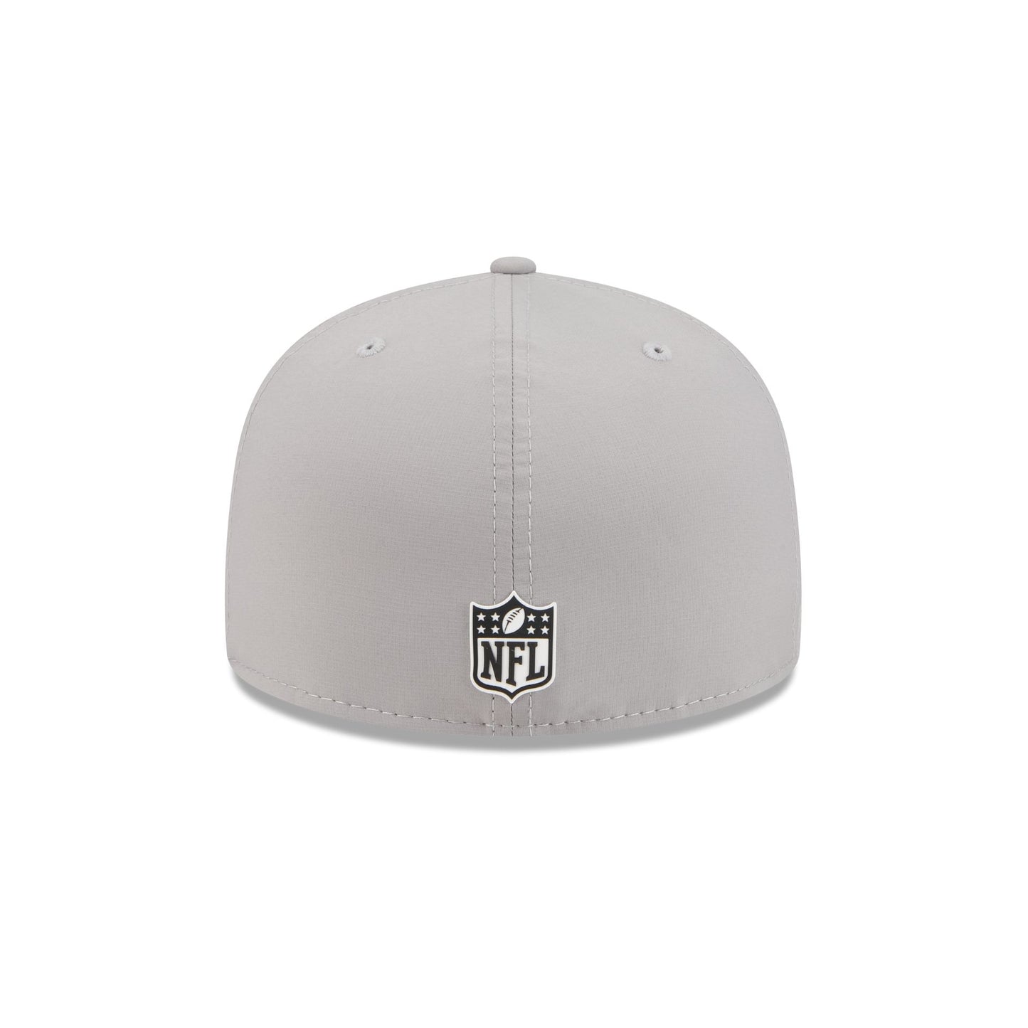 The Atlanta Falcons 2025 Sideline Hot Weather Gray 59FIFTY Fitted Cap features a sewn-down silicone Falcons logo patch at the front panels with a matching Official NFL Shield logo at the rear. The cap has a water-repellent quill tech fabrication throughout, with a quick-dry cushioned sweatband to absorb moisture. The undervisor is accented with a silicone transfer in the team’s colors.