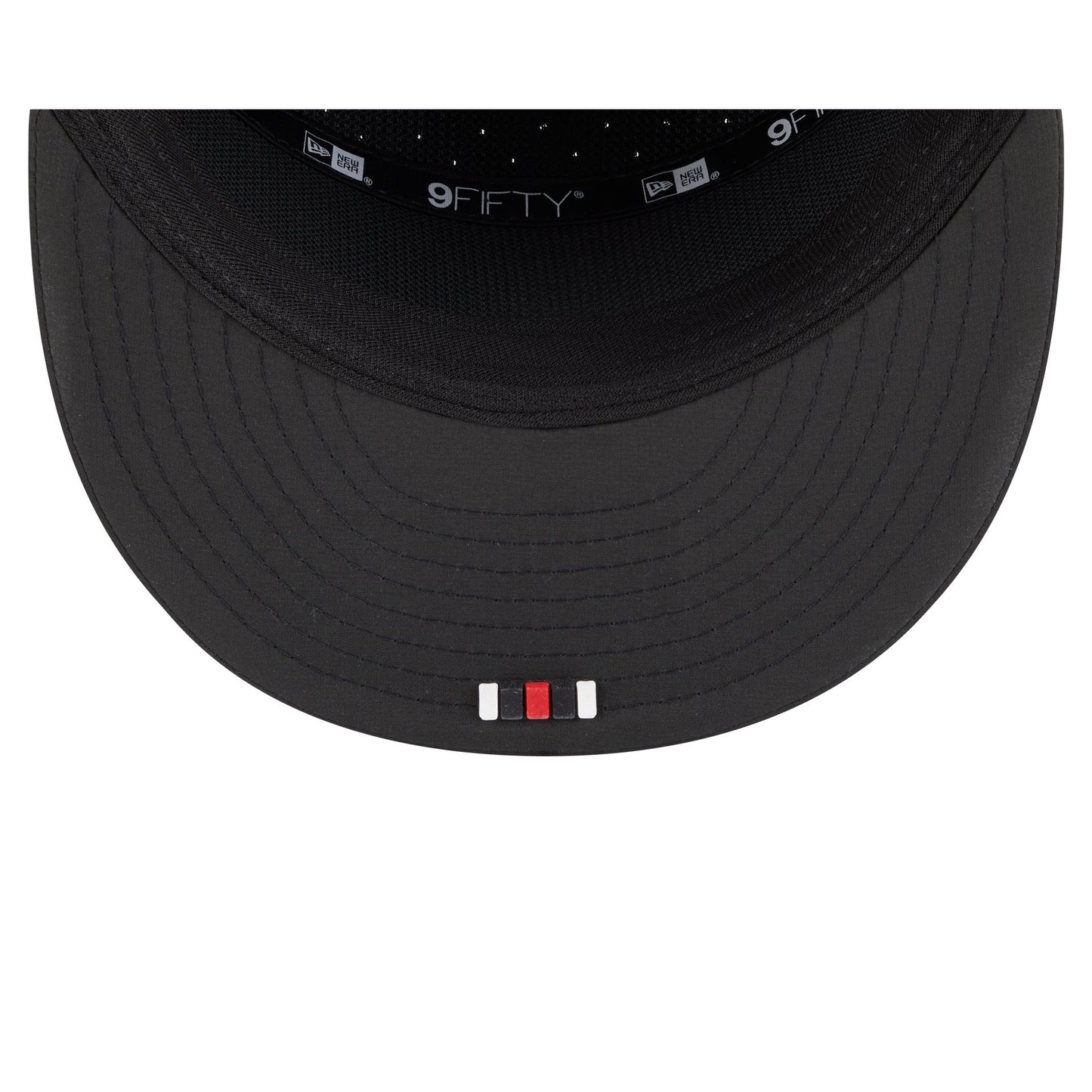 The Atlanta Falcons 2025 Sideline Hot Weather Split Panel 9FIFTY Snapback features a sewn-down silicone Falcons logo patch at the front panels with a split-crown construction. The cap has a water-repellent quill tech fabrication throughout, with a quick-dry cushioned sweatband to absorb moisture. Additional details include the Official NFL Shield logo to the right of a soft silicone snapback closure at the rear. The undervisor is accented with a silicone transfer in the team’s colors.