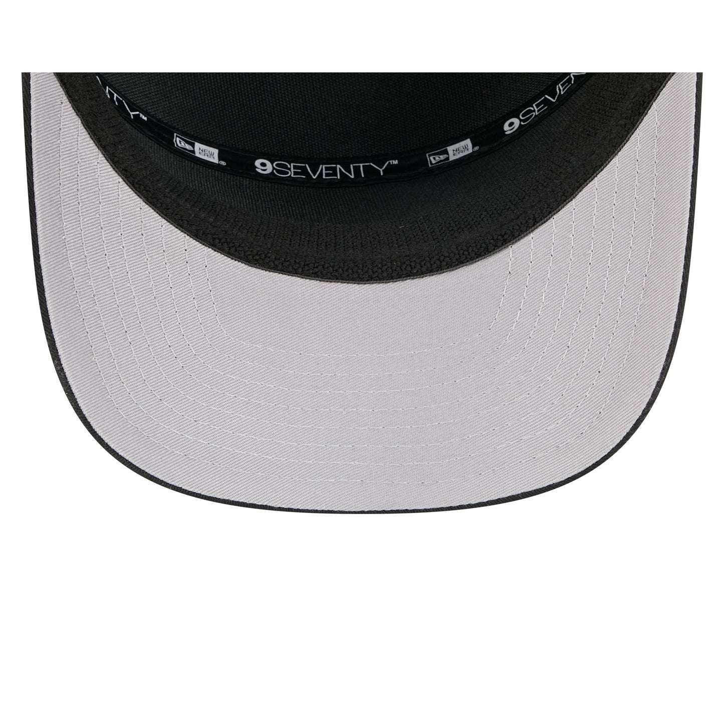The Atlanta Falcons Split Panel 9SEVENTY Stretch-Snap features an embroidered Falcons logo at the front panel with a split crown construction and a rope at the visor. Additional details include an adjustable stretch-snap closure at the rear and a gray undervisor.