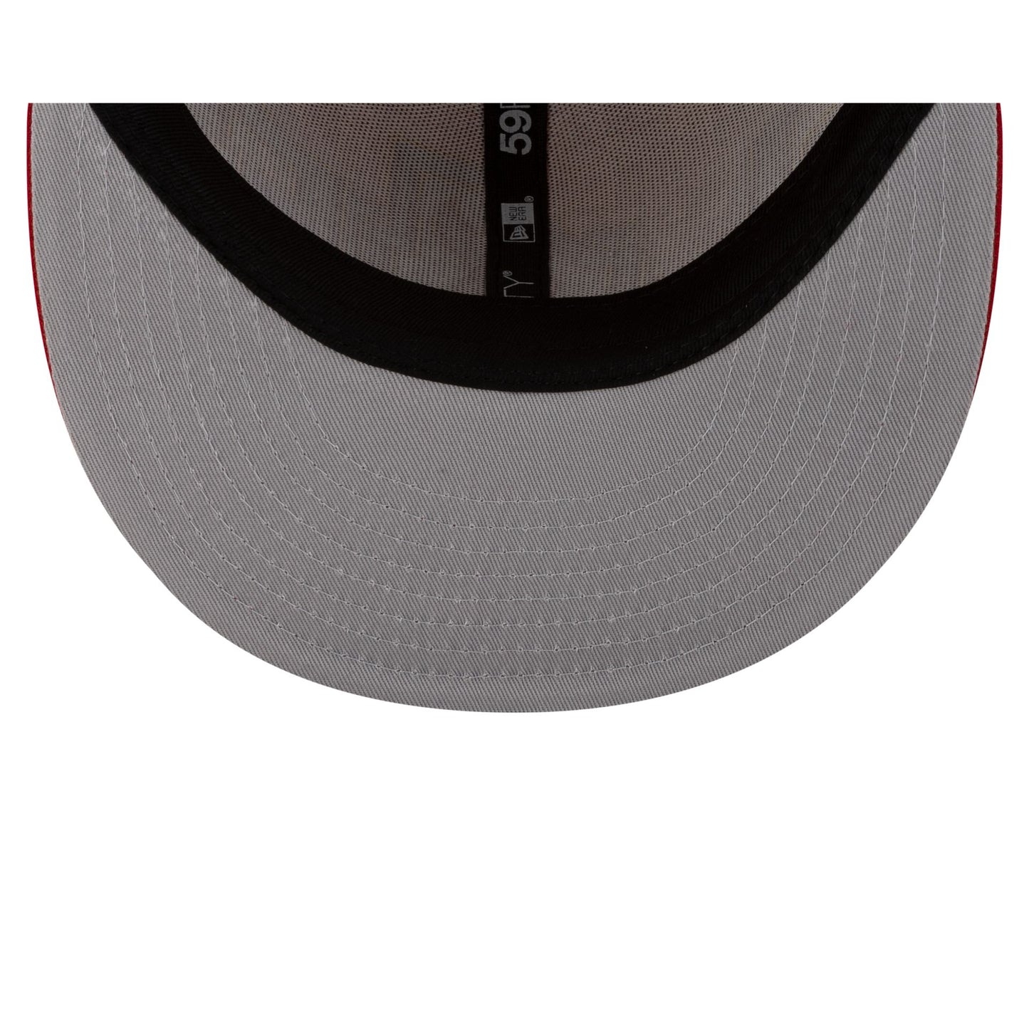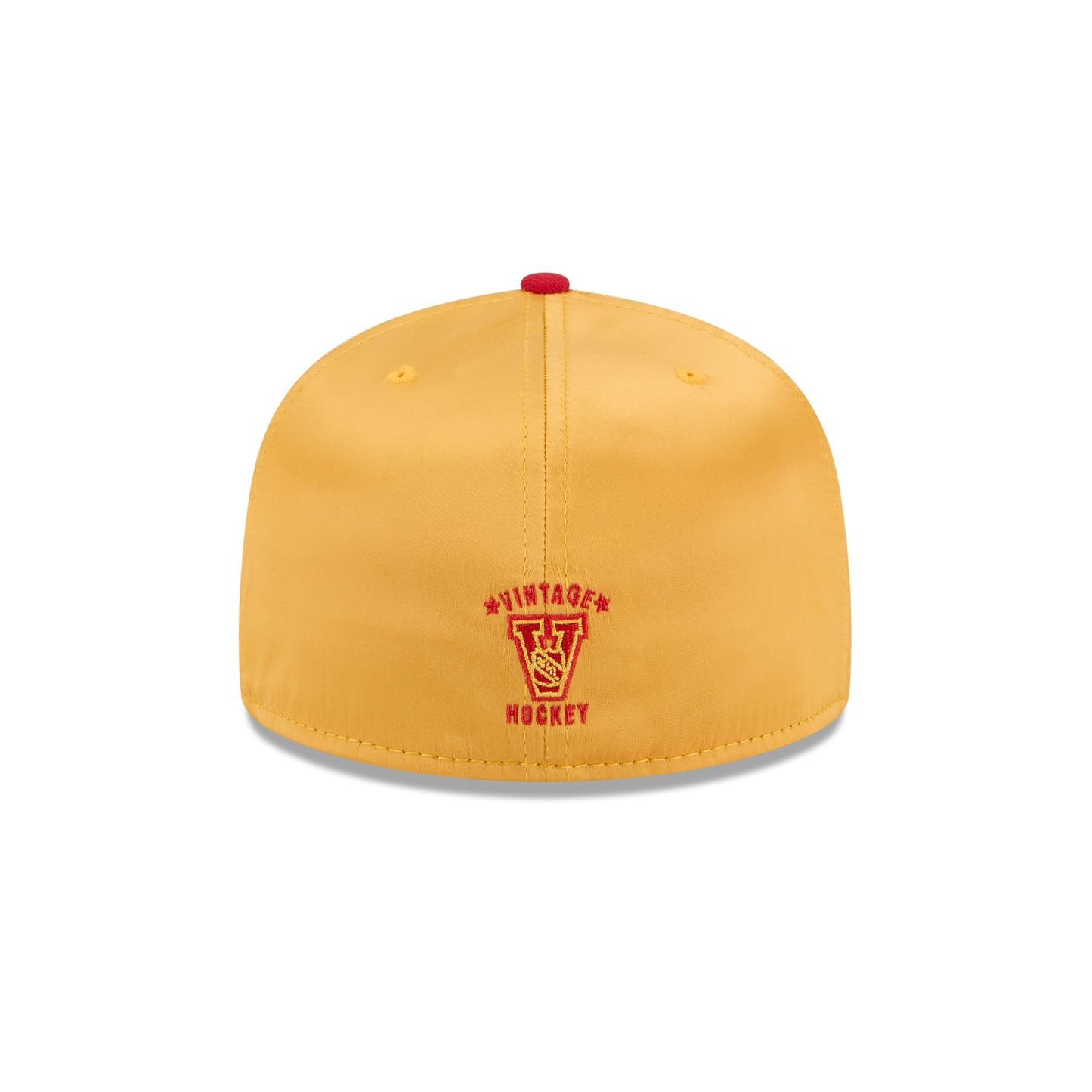 The Atlanta Flames Bold Satin 59FIFTY Fitted Cap features an embroidered satin Flames Historic graphic at the front panels with a satin fabrication throughout. Additional details include a matching Vintage Hockey logo at the rear and a gray undervisor.