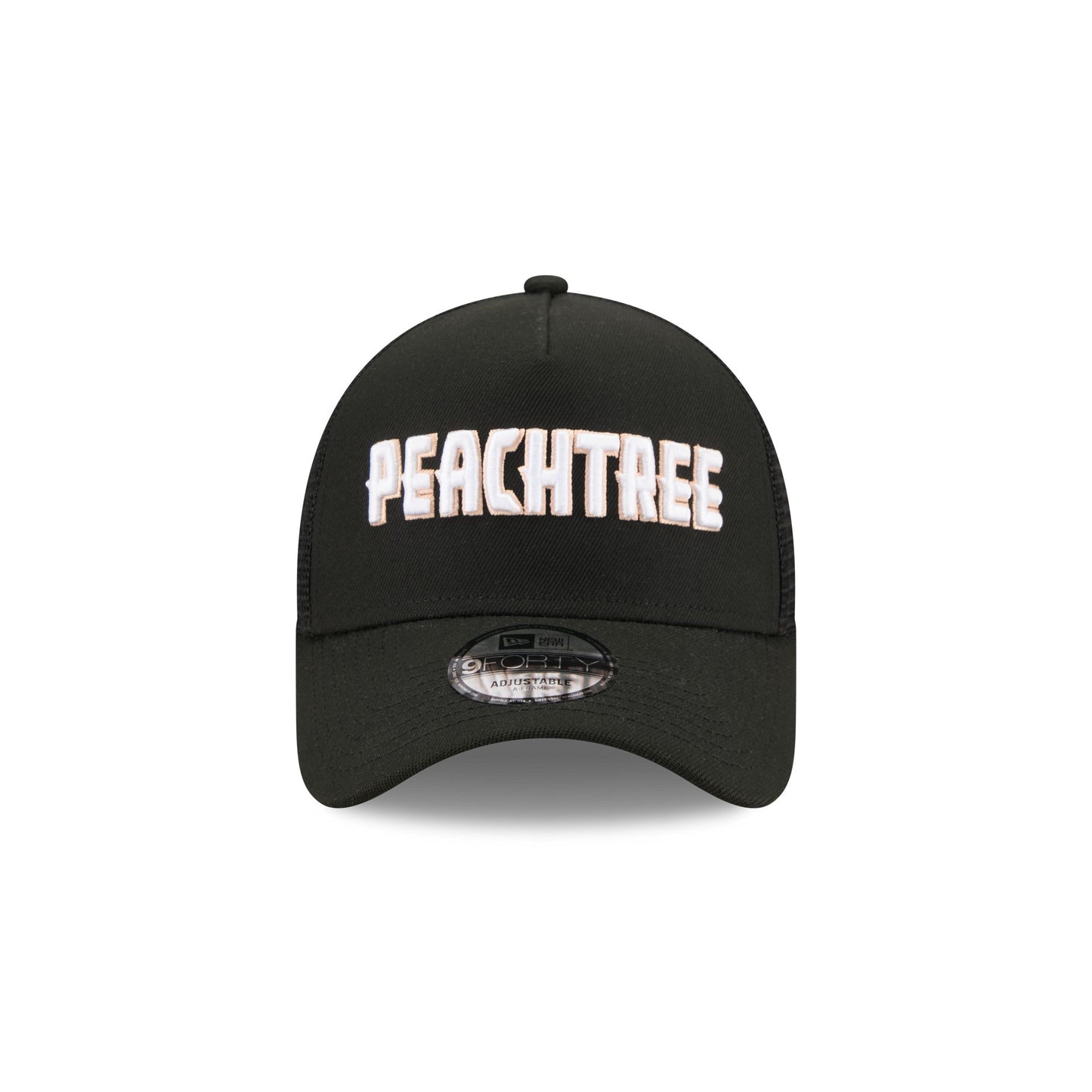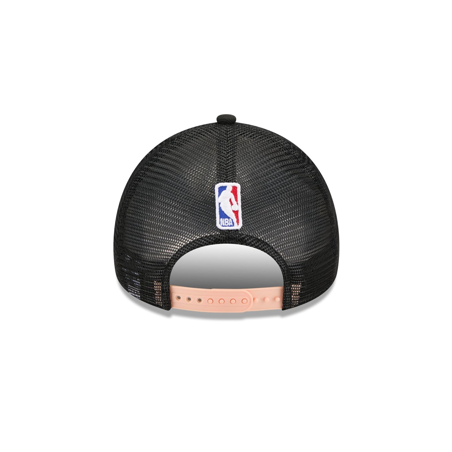 The Atlanta Hawks 2025 City Edition 9FORTY A-Frame Trucker features an embroidered Hawks City Edition logo at the front panels with a logo at the right-wear side. Additional details include the NBA Logoman above an adjustable snapback closure at a mesh rear and a gray undervisor.