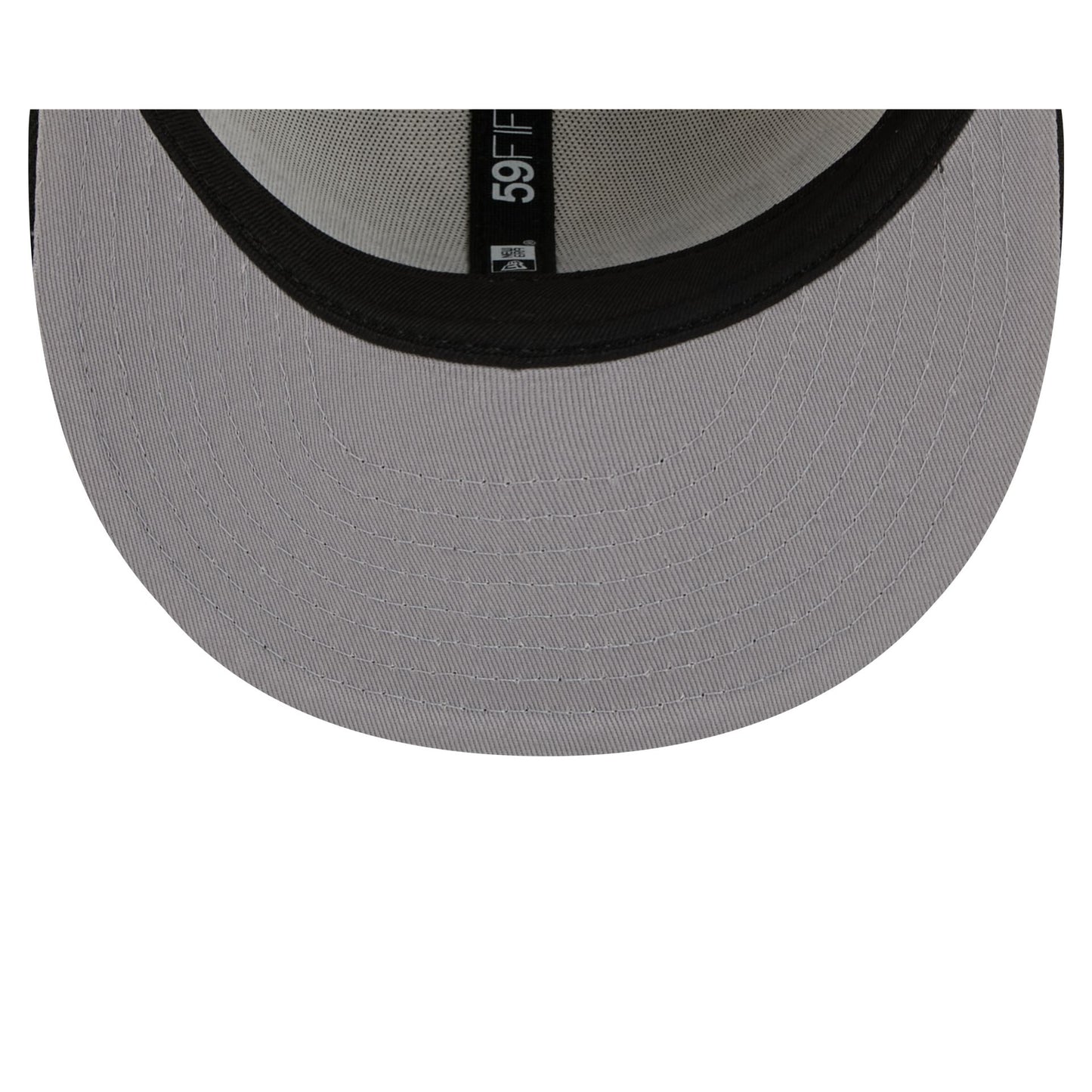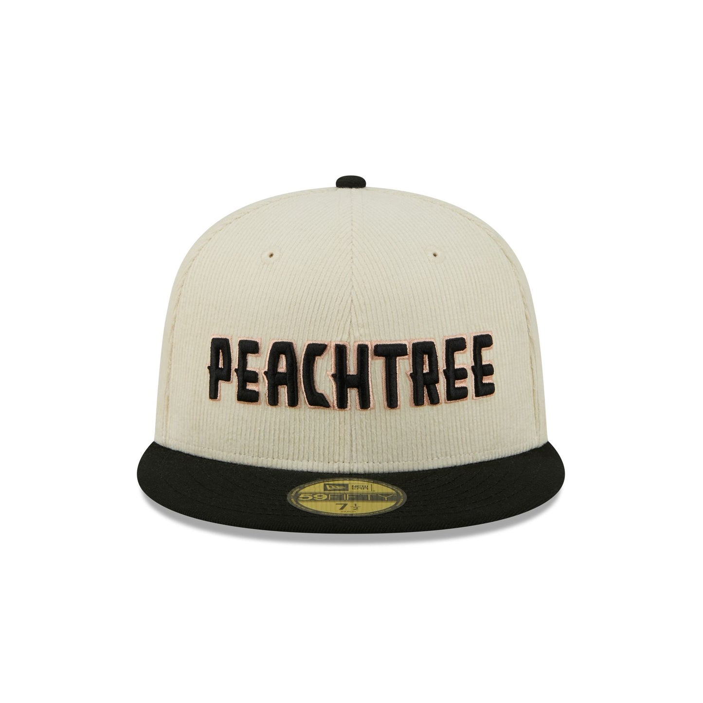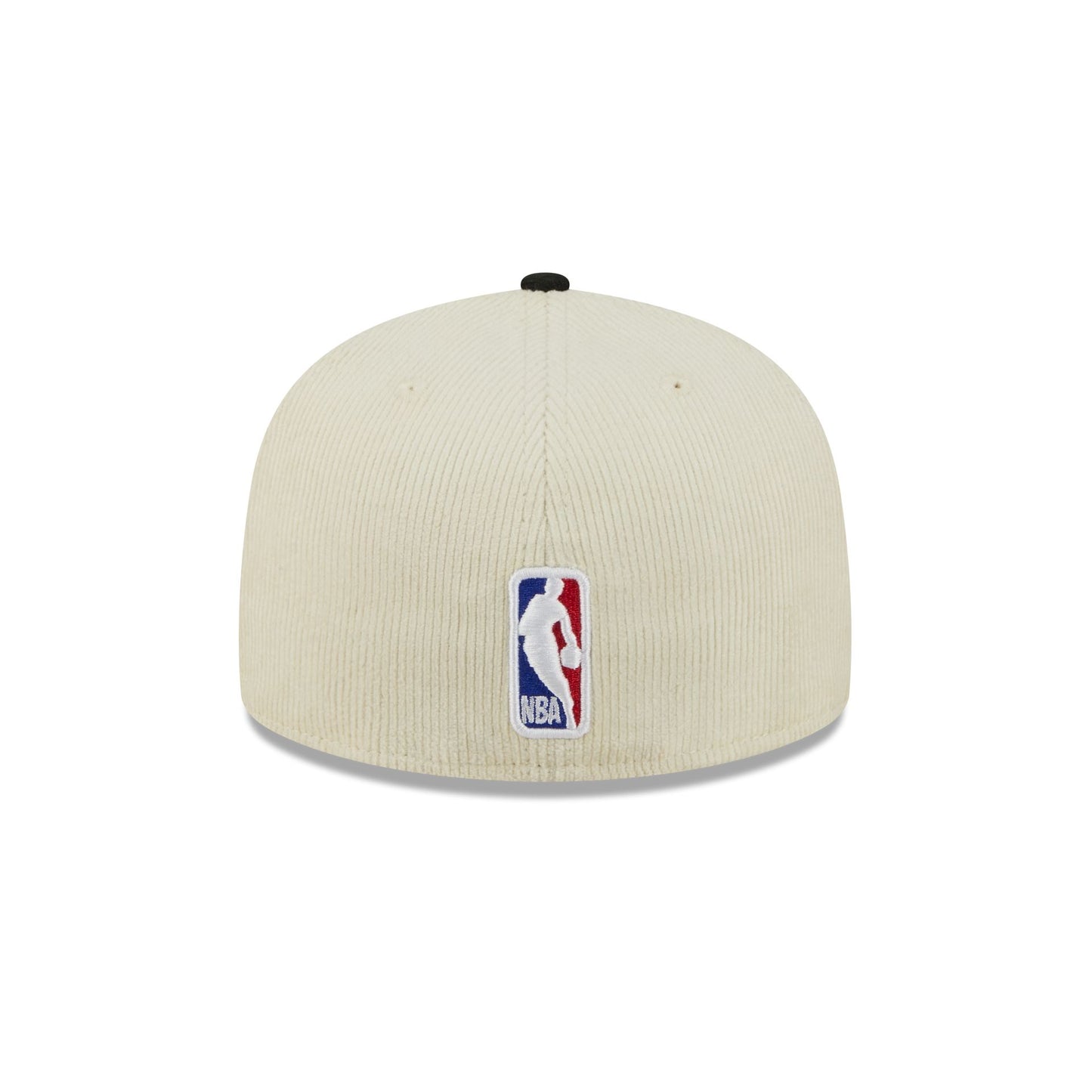 The Atlanta Hawks 2025 City Edition Chrome White Corduroy 59FIFTY Fitted Cap features an embroidered Hawks City Edition logo at the front panels with a City Edition jock tag stitched at the right-wear side. Additional details include a corduroy fabrication, the NBA Logoman at the rear, and a gray undervisor.