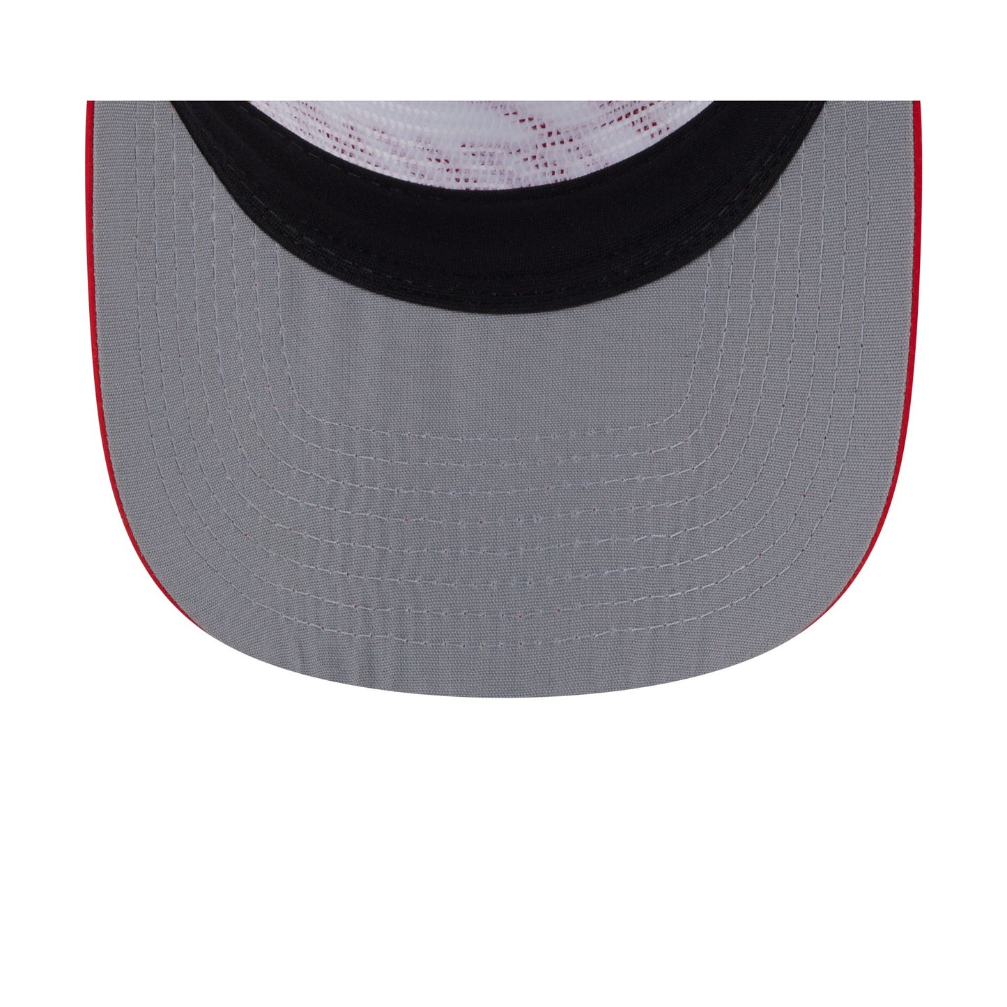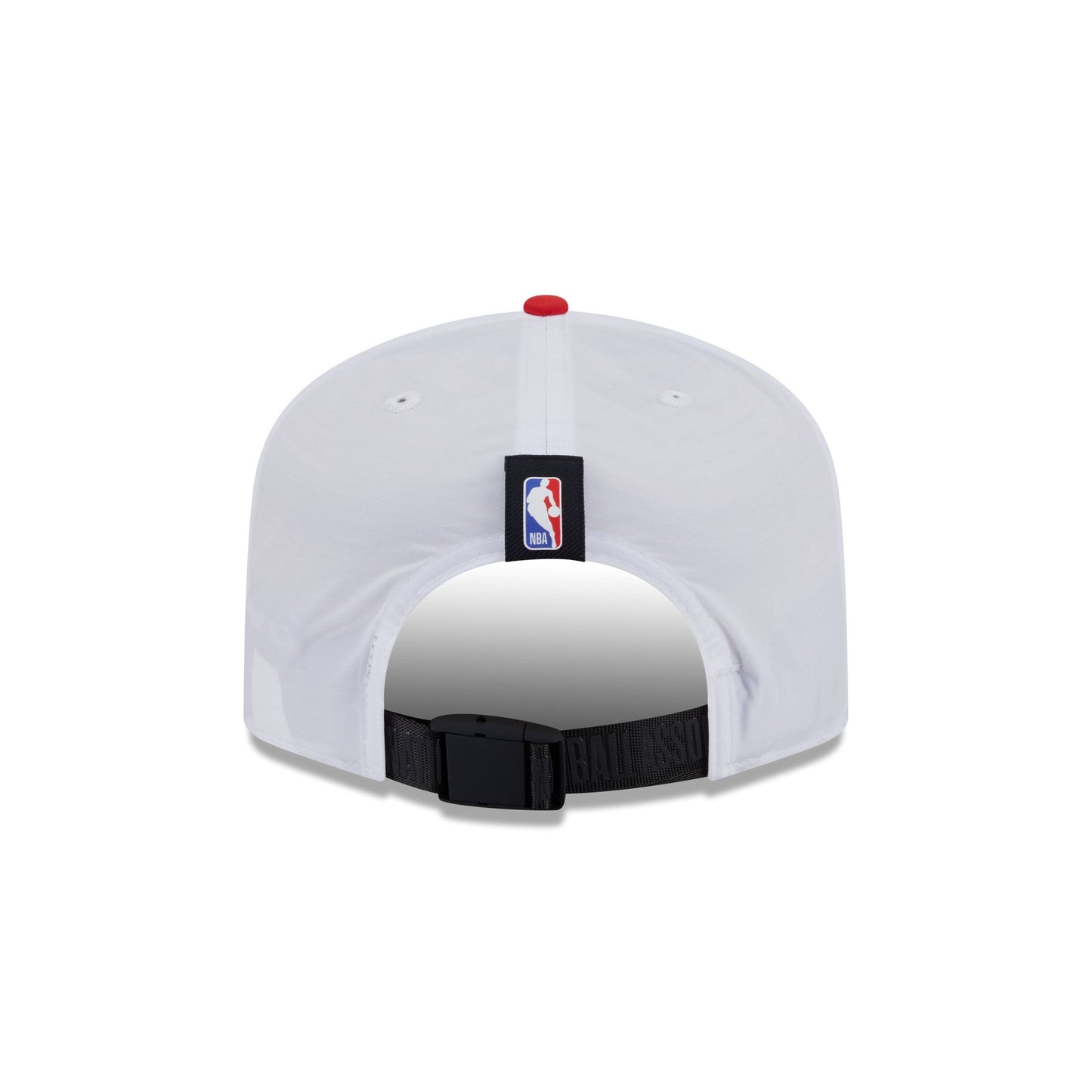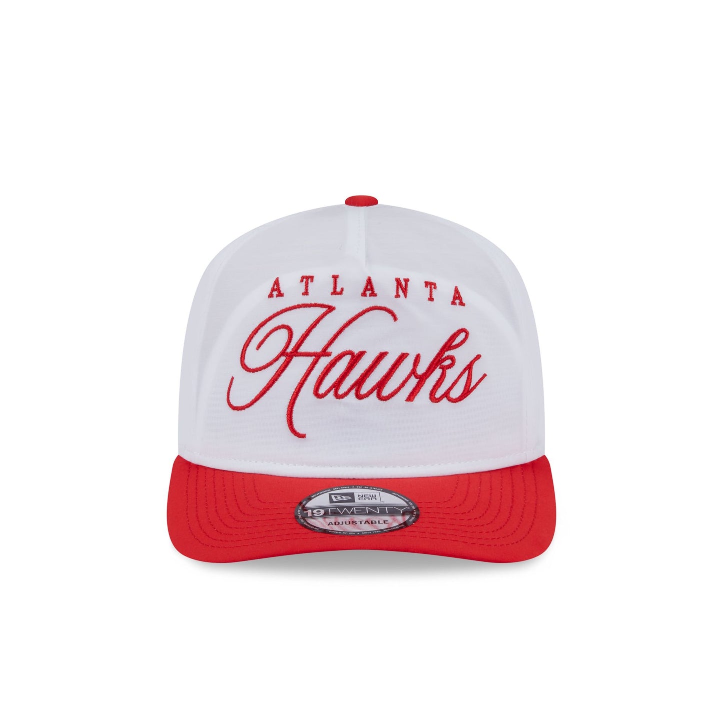 The Atlanta Hawks 2025 Draft 19TWENTY Adjustable Cap features an embroidered Hawks script wordmark at the front panels with a team logo at the right-wear side. Additional details include a woven silicone NBA Logoman patch above an adjustable buckle closure at the rear and a gray undervisor. The strap features a National Basketball Association gel print wordmark.