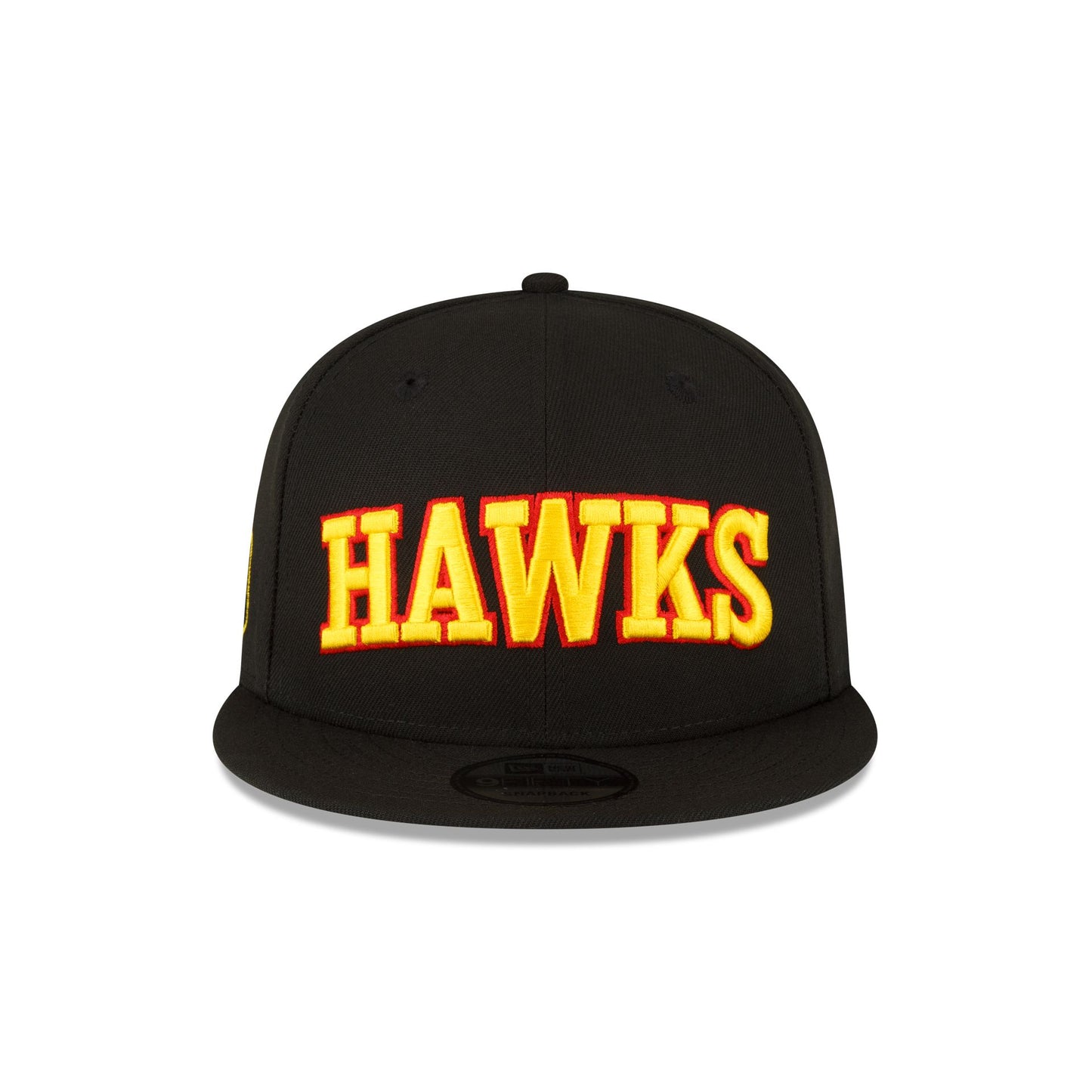 The Atlanta Hawks 2025 Statement Edition 9FIFTY Snapback features an embroidered Hawks Statement Edition logo at the front panels with a logo at the right-wear side. Additional details include the NBA Logoman above an adjustable snapback closure at the rear and a gray undervisor.