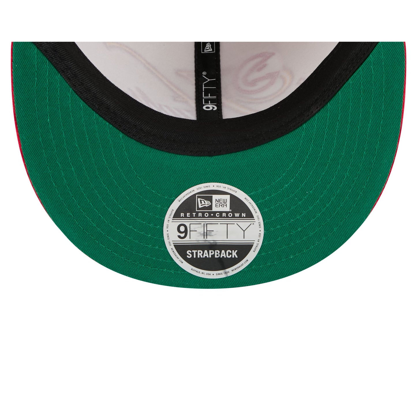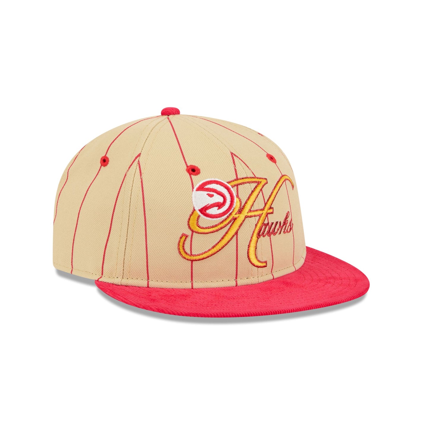 The Atlanta Hawks Pinstripe Script Retro Crown 9FIFTY Adjustable Cap features an embroidered Hawks logo and cursive wordmark at the front panels wit an adjustable belt closure at the rear and a green undervisor.