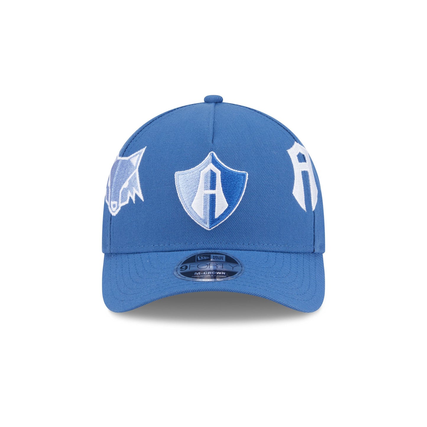 The Atlas FC Indigo 9FORTY M-Crown A-Frame Trucker features the Atlas primary logo embroidered at the front panel with alternate team logos throughout the crown, a team wordmark above a snapback closure at the rear, and a gray undervisor.