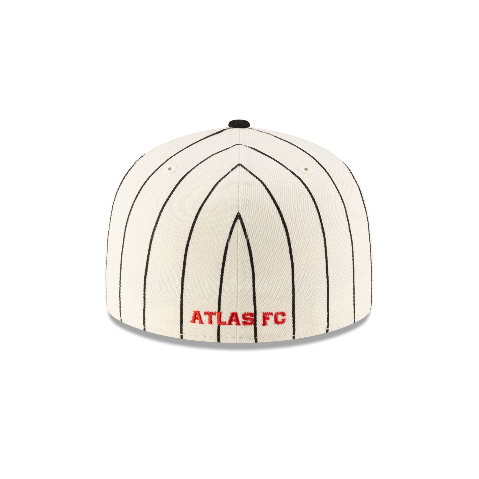 The Atlas FC Retro Pinstripe 59FIFTY Fitted Cap features an embroidered Atlas logo at the front panels with an alternate team logo patch at the right-wear side and team wordmark at the rear.