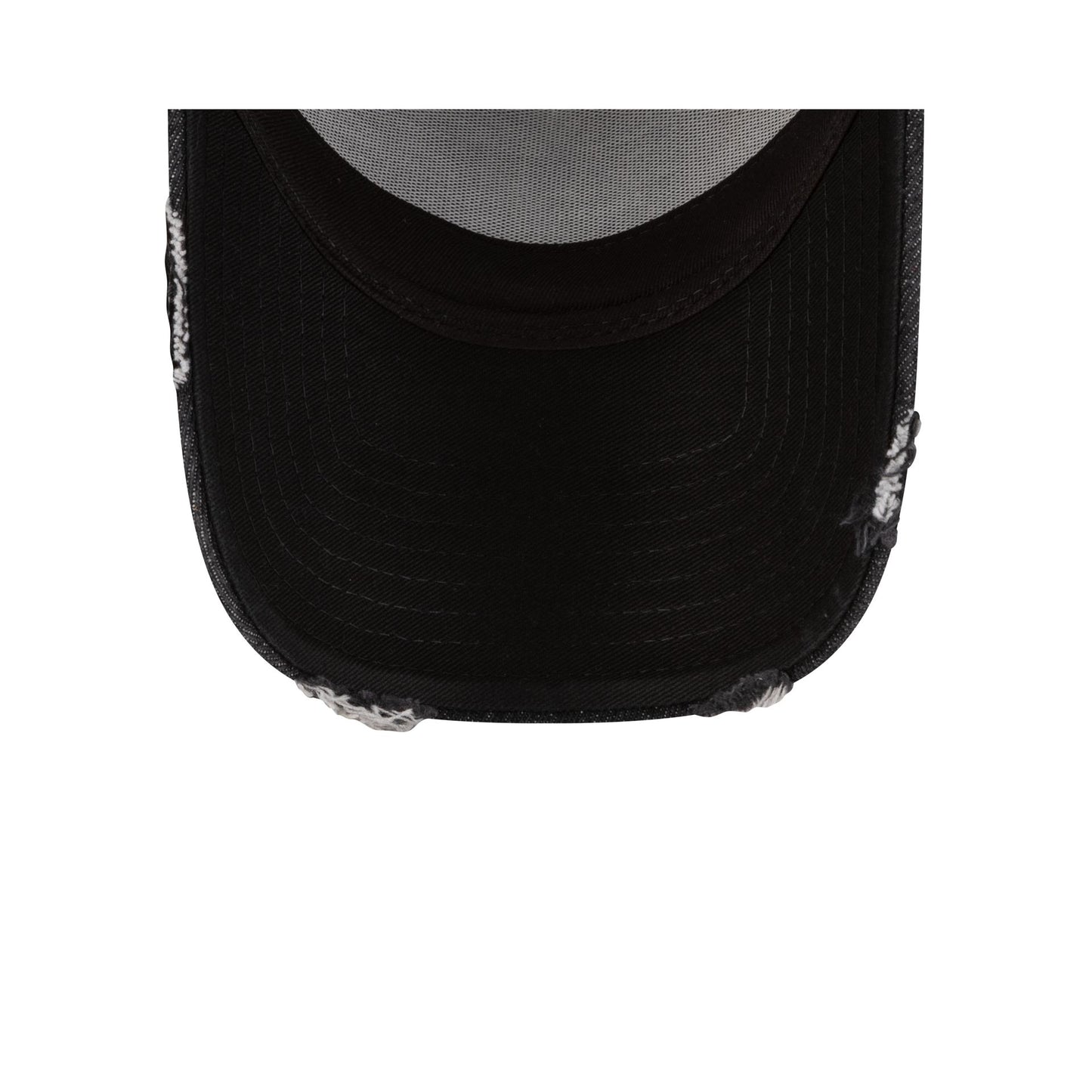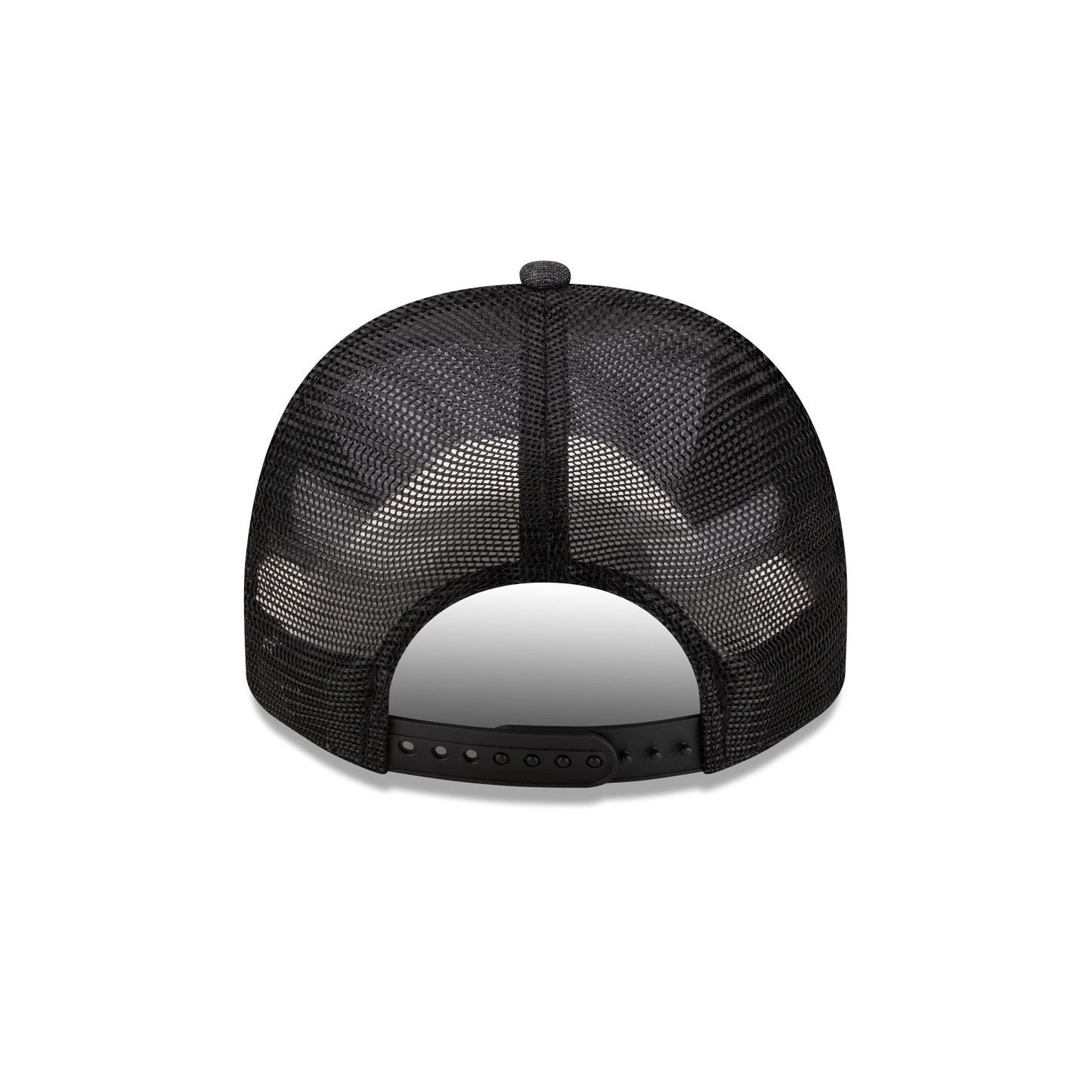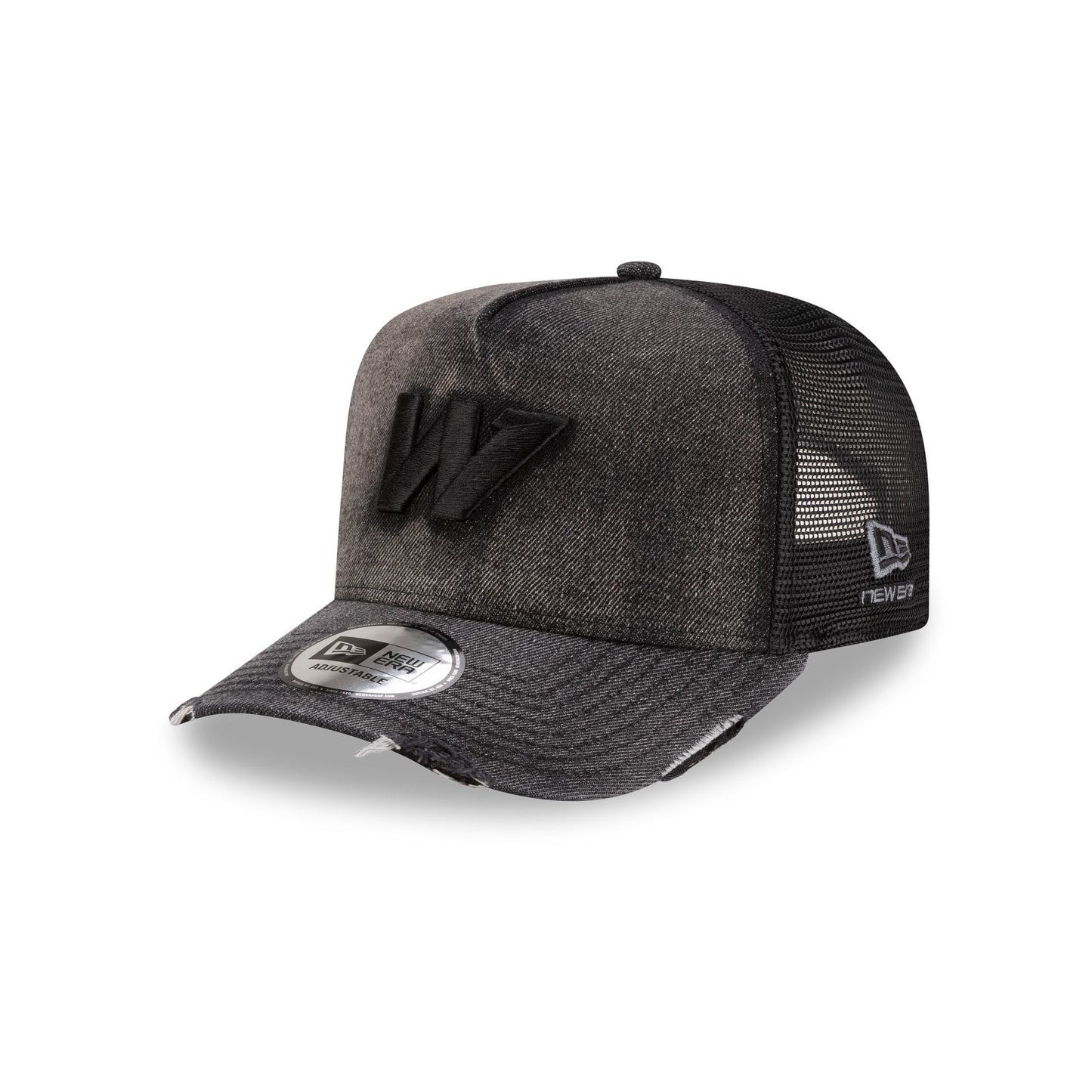 The Atlassian Williams F1 Team Denim 9FORTY A-Frame Trucker features an embroidered team logo at the front panels against a washed and war black denim fabric. Additional details include an adjustable snapback closure at a mesh rear.